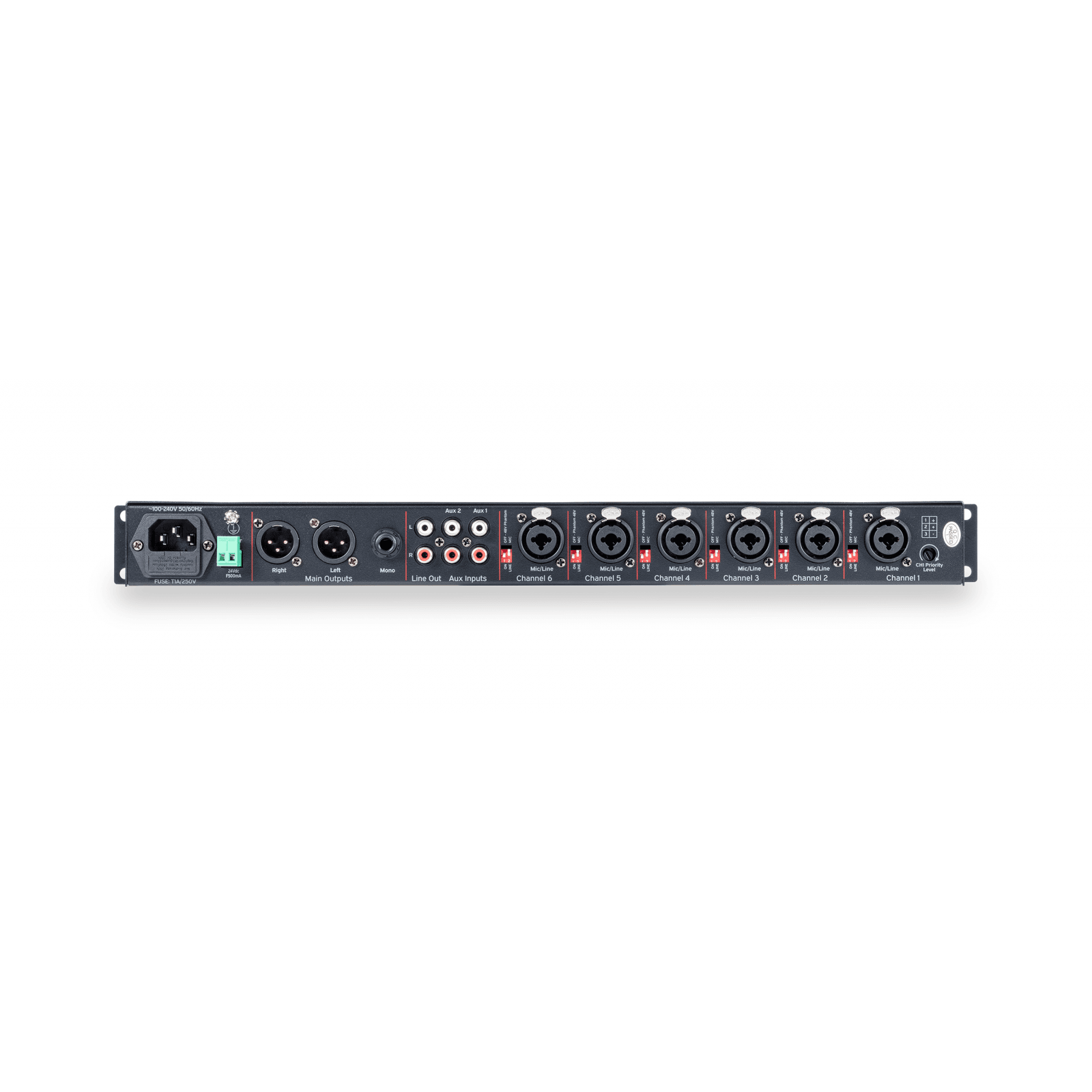The HMIX-622 is designed for Commercial Audio applications where many microphone or line inputs are required. The Mic/Line section consists of 6 combo inputs (XLR + ¼" Jack) with level control, Mic/Line selector and Phantom power in case of condenser microphones. Channel 1 also has Priority function with adjustable threshold. The Aux section provides 2 stereo ... Read more