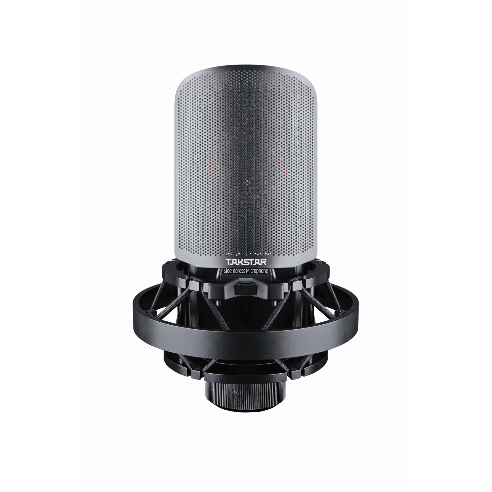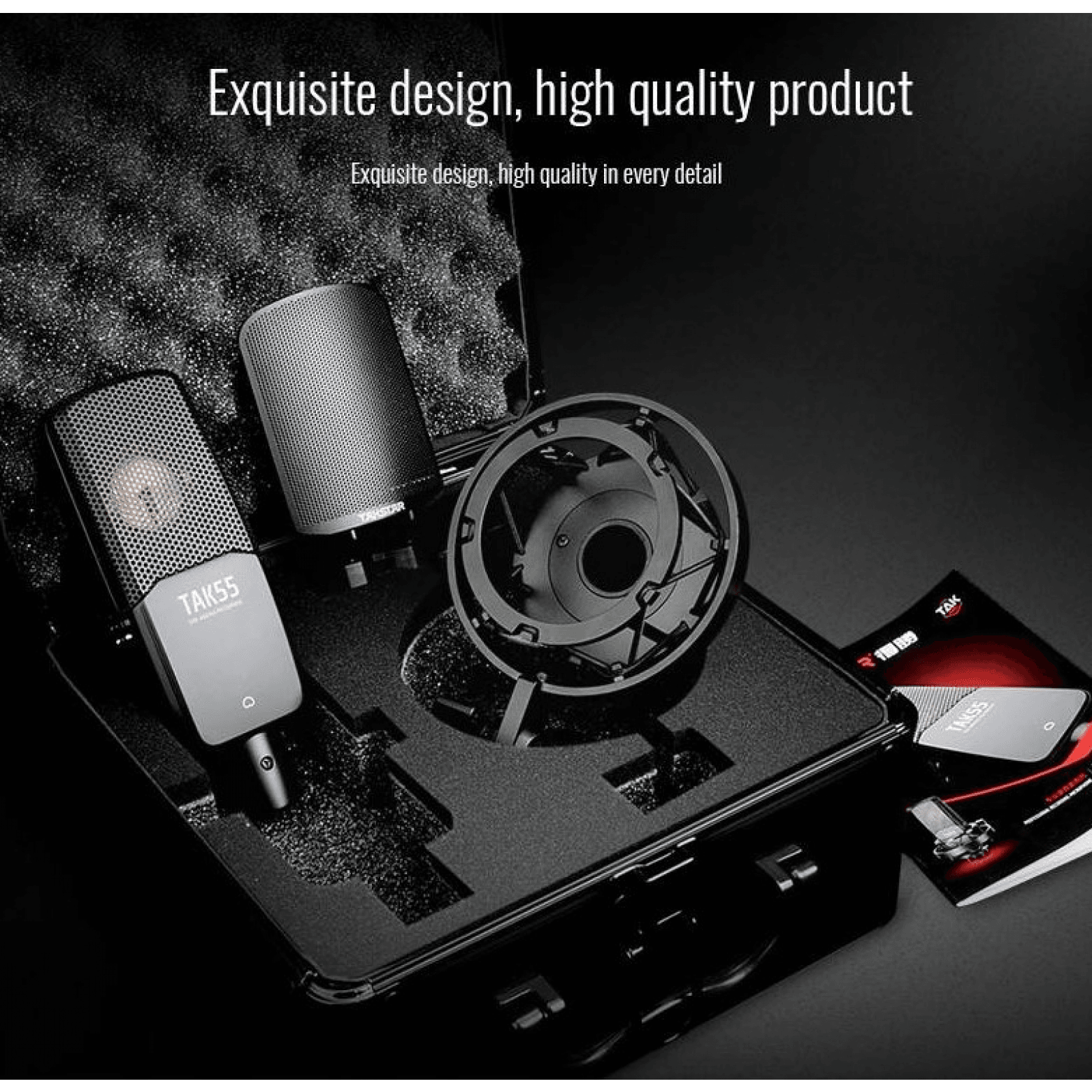 TAKSTAR TAK55 is a professional studio microphone equipped with a 32mm gold plated large diaphragm cartdrige. Sound reproduction is extraordinary pure meeting requirements of professional studio recording. Human voice, acoustic instruments like piano and guitar can be recorded and reproduced with an incredible clear and realistic result. The microphone is equipped with both Bass and Sensitivity attenuation switches very useful respectively to reduce bass noise and eleminate proximity effect. To ensure flexibility to recording applications 3 different directivities are selectable: cardioid, bidirectional and omnidirectional. The rugged metal housing has been enriched with a perfectly integrated windscreen in a effective and well conceived way inspiring superior performances. A stable shockmount is supplied with the microphone and prevents unwanted noise from vibrations, Together with the interference free design, TAK55 sets among the best studio recording microphones. Collapse text