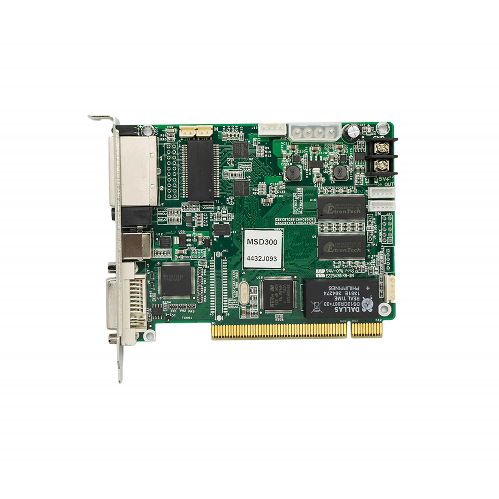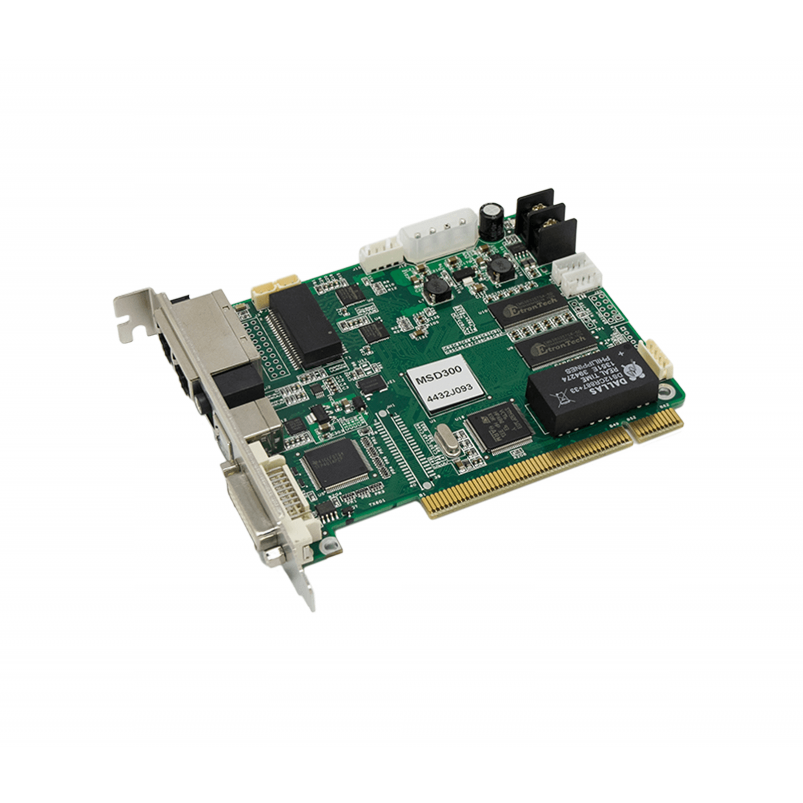 The MSD300 is a sending card developed by Novastar. It supports 1x DVI input and 2x Ethernet outputs. A single MSD300 supports input resolutions up to 1920×1200@60Hz and loads up to 1,300,000 pixels.