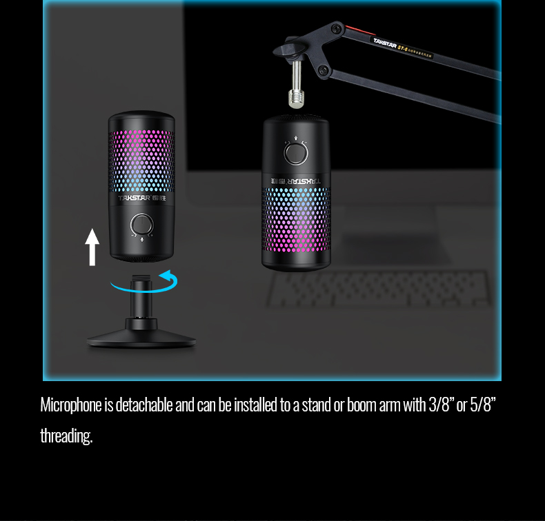 Microphone is detachable and can be installed to a stand or boom arm with 3/8" or 5/8" threading.