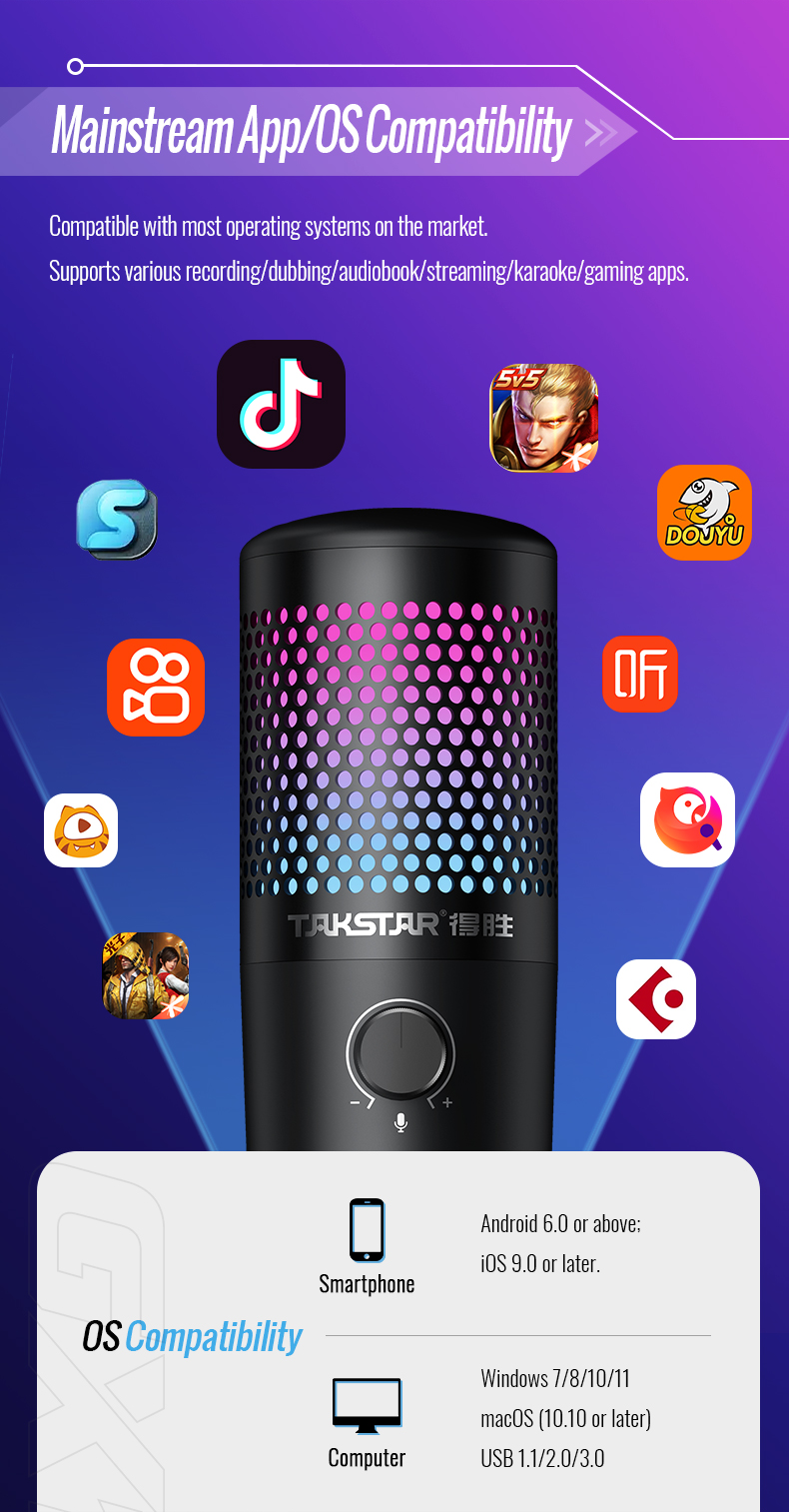 Supports various recording/dubbing/audiobook/streaming/karaoke/gaming apps.