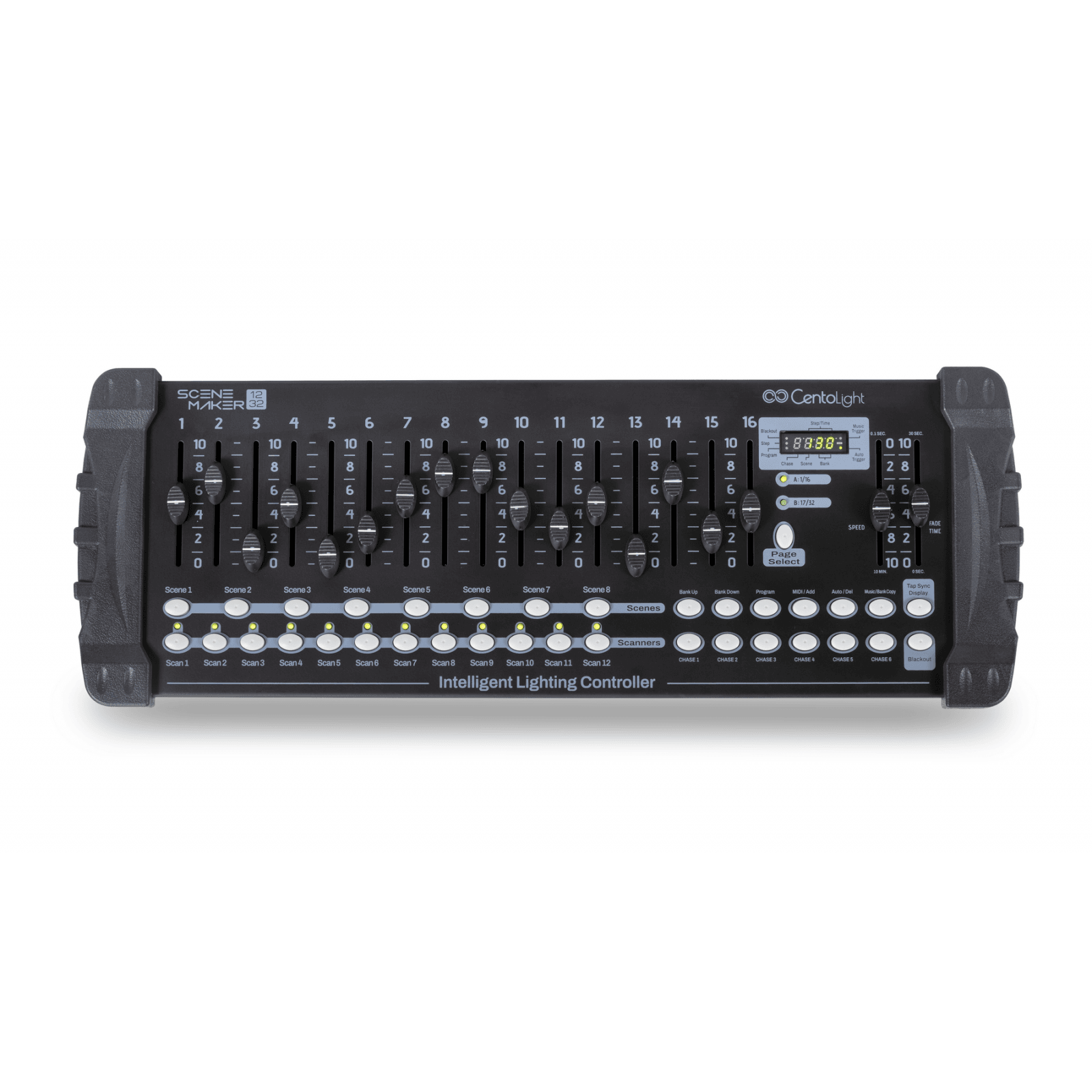 SCENEMAKER 1232 is a universal intelligent lighting controller. It allows you to manage up to 12 fixtures composed of 32 channels each (384 channels in total), and up to 240 programmable scenes. 6 chases can contain up to 240 steps composed by the saved scenes (the steps) and in any order. Programs can be triggered by music, MIDI, automatically or manually. On the surface you will find various programming tools such as 16 universal channel sliders, quick access scanner and scene buttons, and a LED display indicator for easier navigation of controls and menu functions.