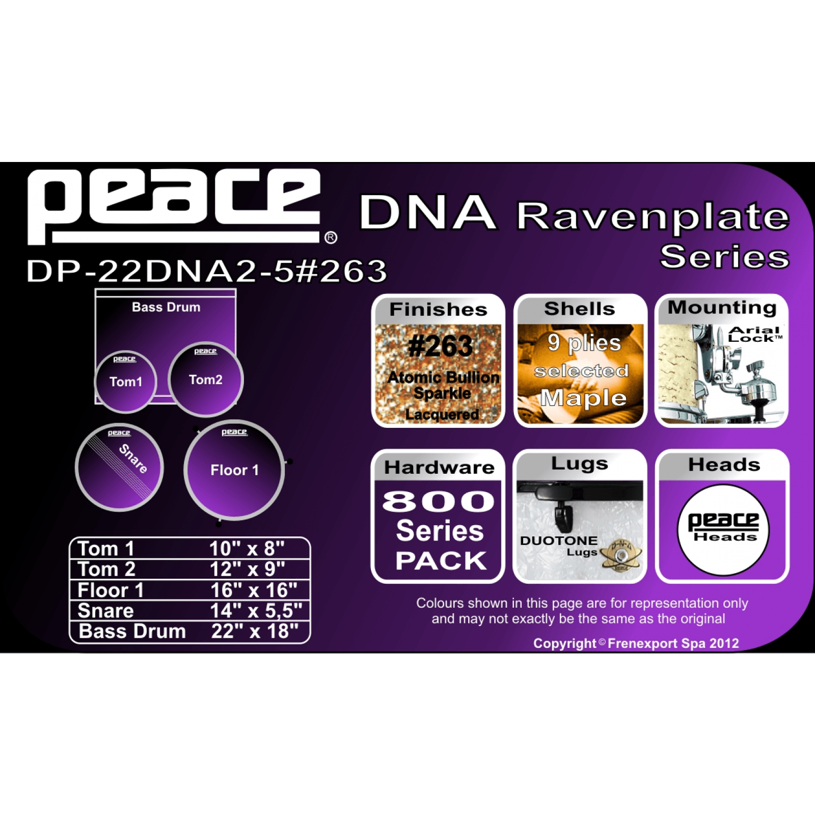 Peace’s top-of-the-line package kit, the DNA series resides at the crossroads of rugged and handsome, where professional quality meets affordability. A versatile kit designed to capture the quintessential modern drum set sound, the DNA series combines heavy duty series 800 hardware including both a straight and a boom stand, and 9-ply lacquered North American maple drums in a package that includes rims-mount toms, low-mass lugs, die-cast claws, and brass vents, among many stand-out features. The series is offered with chrome or black-trim hardware, and custom sizes and finishes are also available by special order. It ain’t broke, so we didn’t fix it. Peace’s DNA series has been a preferred choice by artists and endorsers for years, and it’s been heralded as “a pro-level kit at a very affordable price” by DRUM! Magazine. Shown in one of Peace’s new finishes, black castle, a three color sparkle lacquer finish with a triple sparkle overlay belt that explodes chards of color under stage lighting. Collapse text