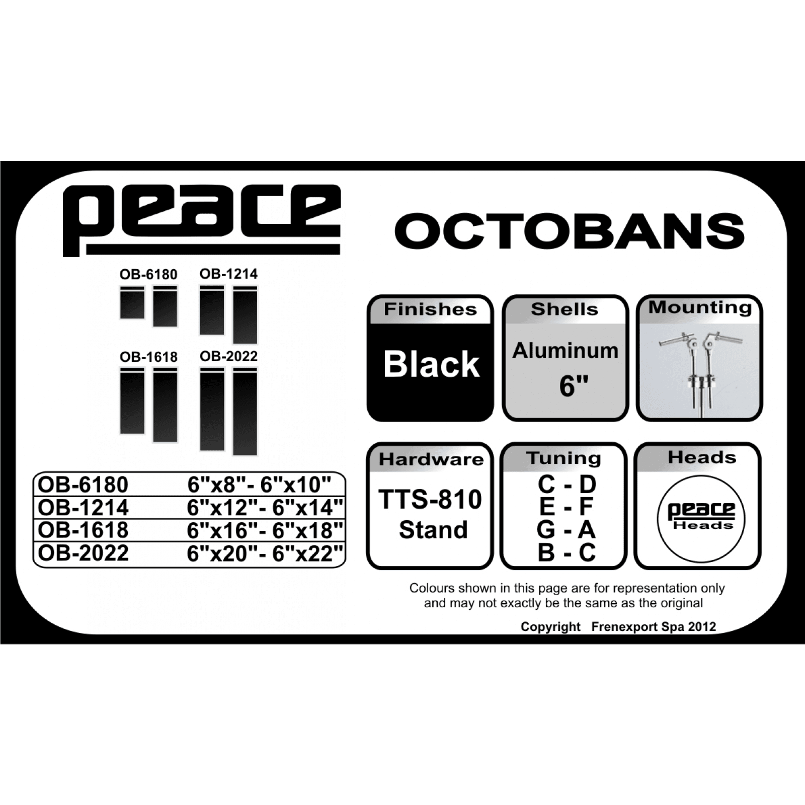 The sharp metallic BARK! Peace Octabons are the perfect sonic addition for the ever-evolving drummer of today.? Each aluminum shell is precision milled to a 6" diameter and cut to span in depths from 8" to 22" to provide contrast to the warmth of standard wood drums.? Double Octabon packages include our Arena 860 dual tom stand for stable placement anywhere on the kit. Whether as a two-drum expansion for an existing set-up, or an addition of the entire octave (all 8 drums, tuned high C to low C,) Peace Octabons are an onslaught of percussive possibility! Collapse text