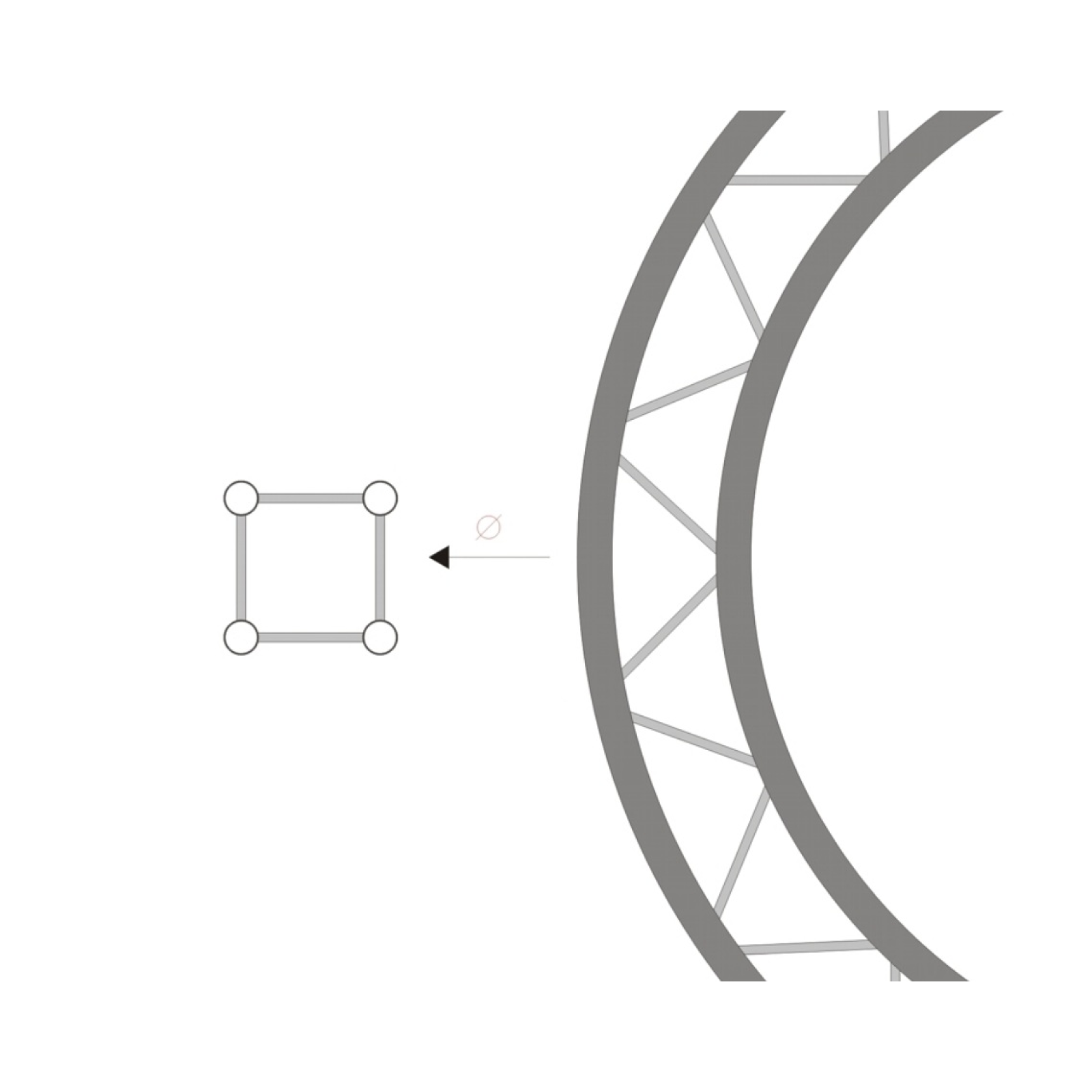 Circular truss section with a total diameter of 3 meters in square format. Manufactured with a main tube measuring 50 mm in diameter and 2 mm in thickness, and an auxiliary tube measuring 16 mm in diameter and 2 mm in thickness. Available in different external diameters. Compatible with the FP Series.