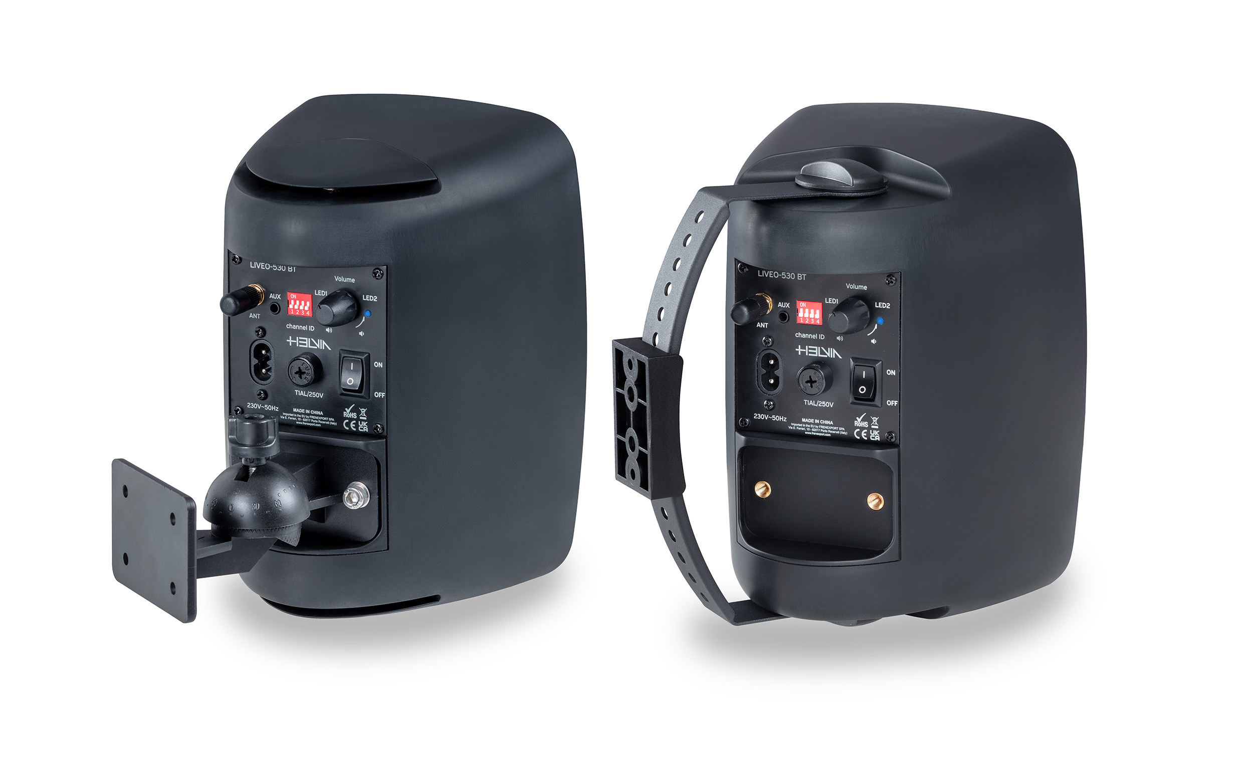 Each Liveo series speaker, in order to simplify installation as much as possible, comes with both a "C" bracket and a "ball-shaped" bracket, both with adjustable horizontal and vertical positions.