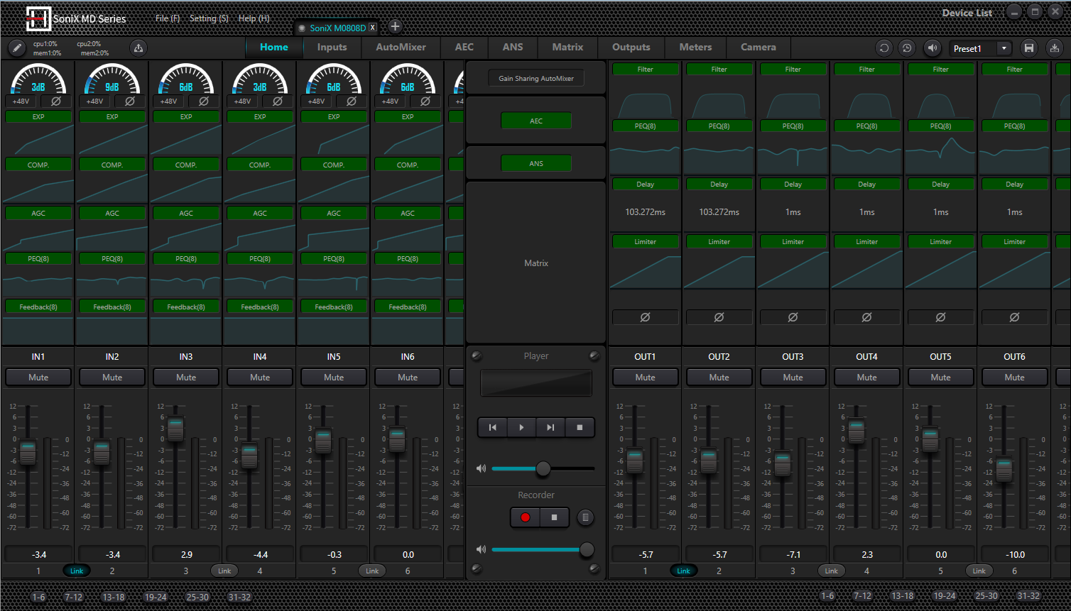 Every analog or Dante input comes equipped with a suite of powerful processing tools, including a Compressor, Expander, Auto Gain Control, an 8-band Parametric EQ, and an 8-filter Feedback Suppressor (static or dynamic). On the output side, analog and Dante outputs feature Crossover filters, 8-band Parametric EQ, delays up to 1200 ms, and limiters, ensuring precise control over the audio signal at every stage.
