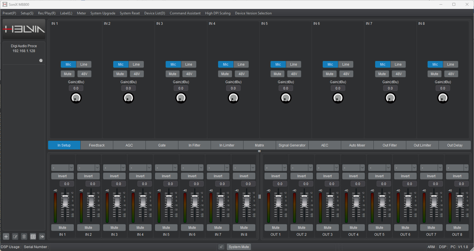 At the heart of the system is a 400 MHz floating-point DSP paired with a 1.2 GHz Linux-based dual-core control chip, ensuring exceptional processing capacity and enabling future configuration expansion by adding inputs and outputs based on installation needs. In a market where microphone preamplifier quality is often sacrificed, the SoniX M8800 stands out with its ultra-low-noise preamps, delivering a noise floor as low as –100 dB—allowing a wide dynamic range and outstanding clarity even with very weak signals.