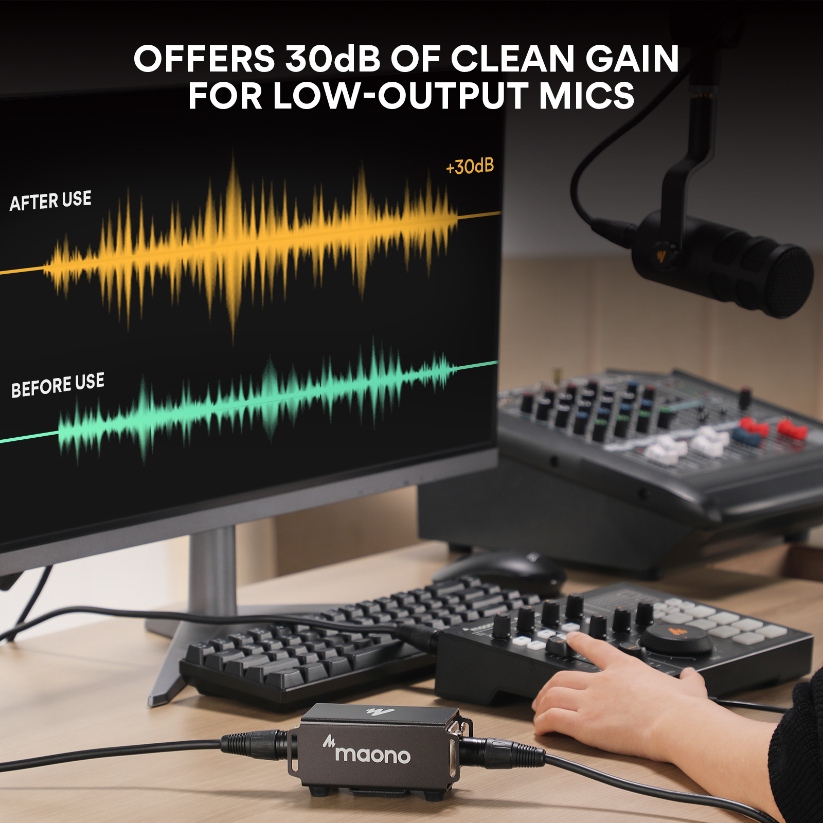 In the wide range of microphone accessories, MAONO includes the MA100 preamplifier for dynamic and ribbon microphones. The MA100 is very useful when there is no way to drive a dynamic or ribbon microphone well directly using a normal audio interface as the sound would still be too low. Using the MA100 microphone preamplifier, you will get a clean and constant 30dB gain without distortion thus emphasizing the clarity and character of the output sound. MA100 can be used in various fields of application such as professional audio studios, podcasts and live streaming. The elegant finish, portable size and solid construction are other features that contribute to the high quality of the MA100.