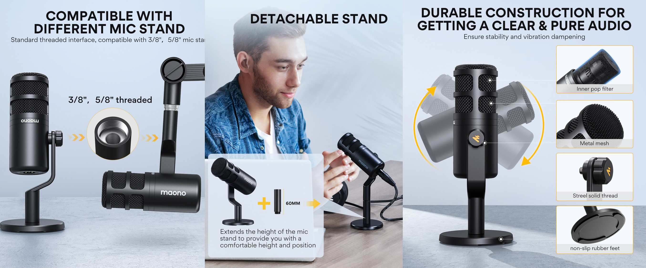 Maono PD100 is a dynamic microphone with a cardioid polar pattern to reduce background noise for a cleaner audio. There is a standard XLR output on the microphone for connecting audio interfaces or mixer. The full metal body delivers excellent shielding performance and durability.