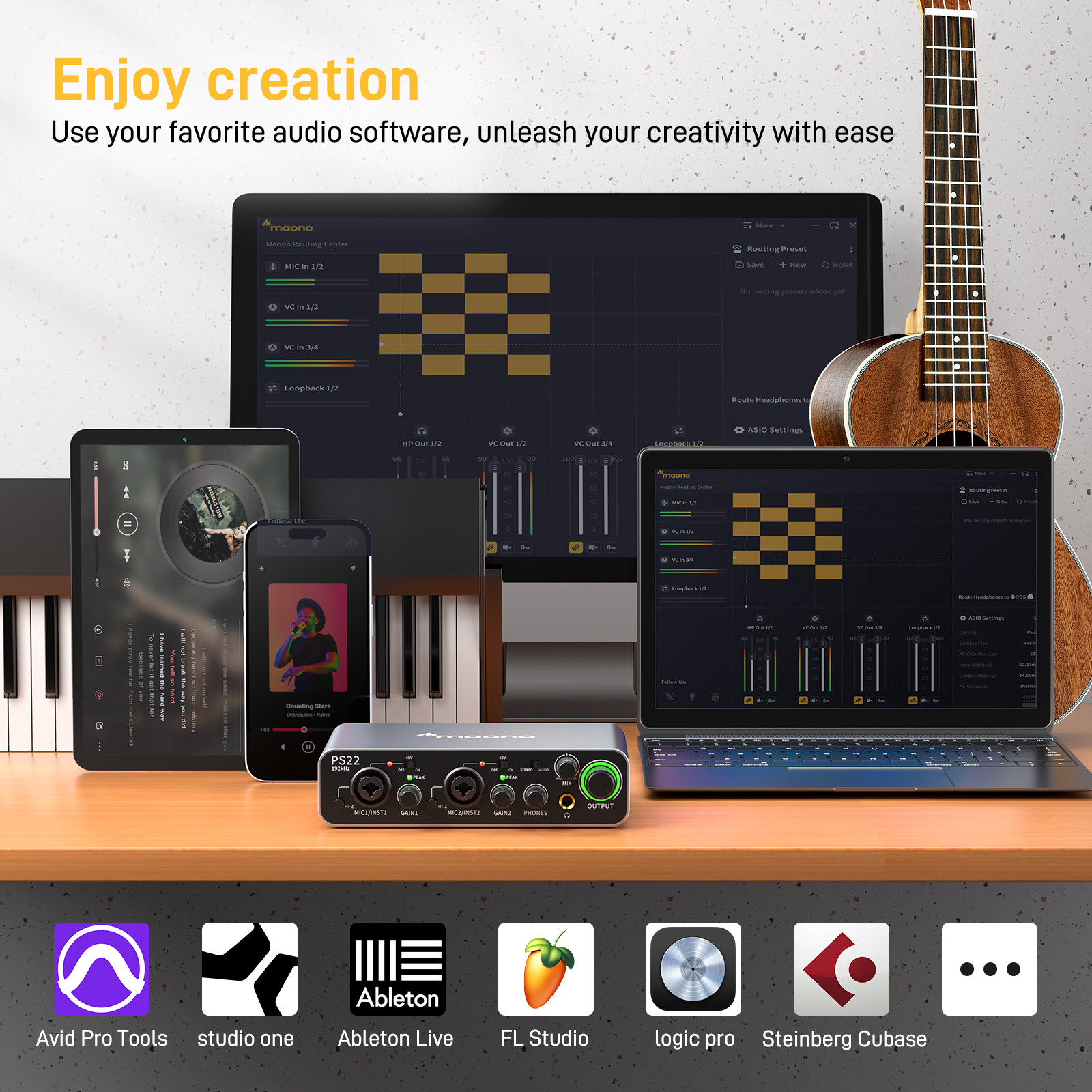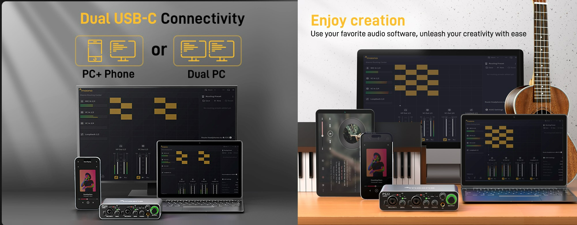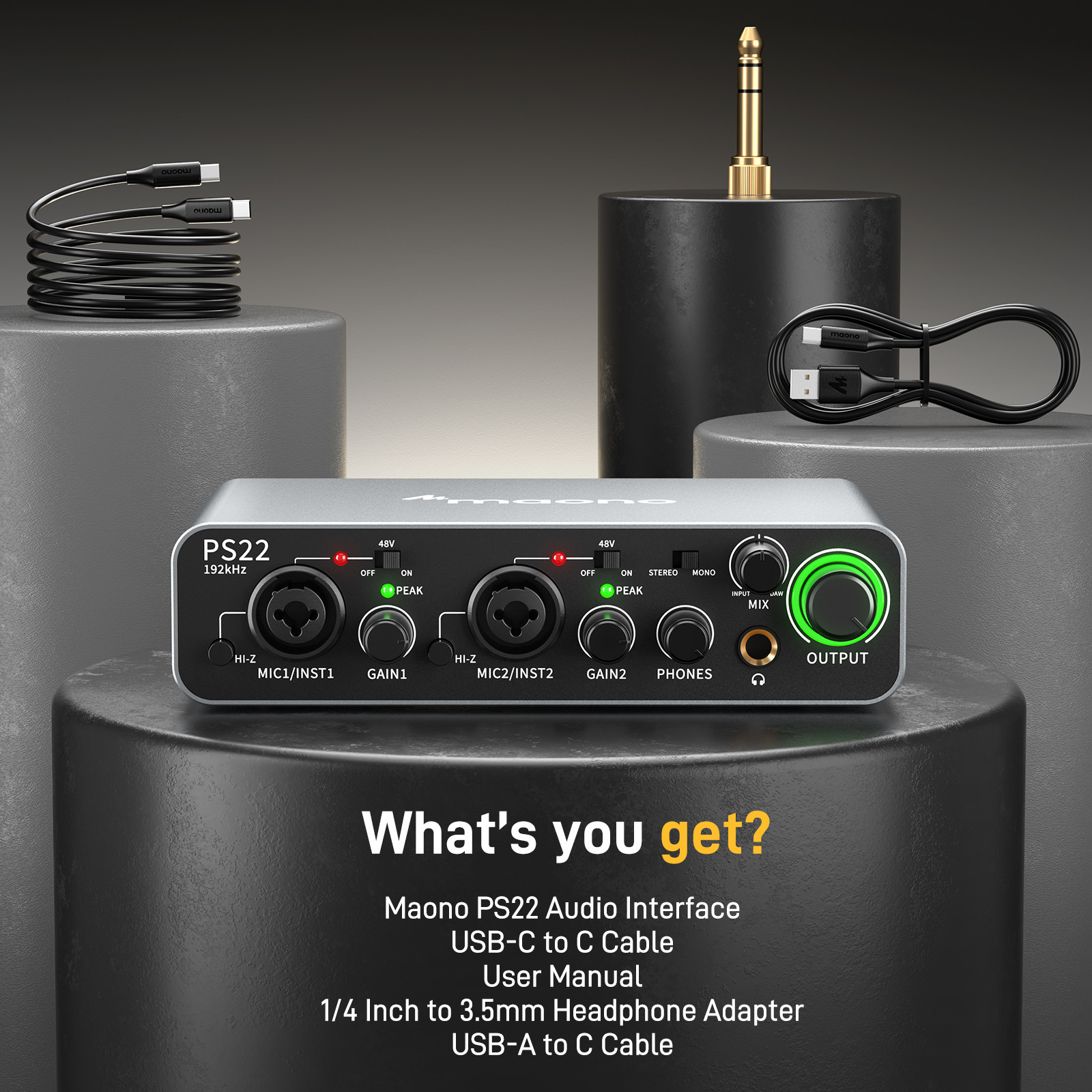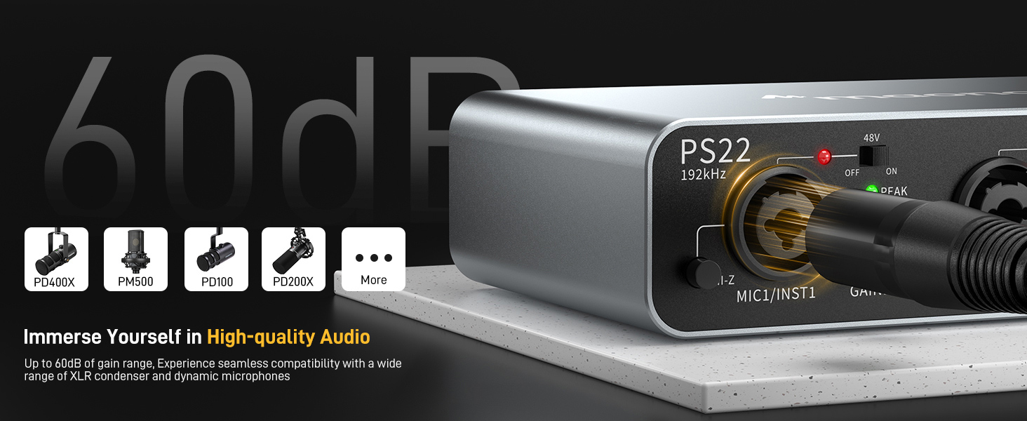 Maono ProStudio PS22 streaming audio interface is the ultimate solution for recording high-quality audio and connecting to a wide range of equipment. Featuring premium preamps with up to 60dB of gain range, 24bit/192KHz sampling rate, and 2-in/2-out configuration, the PS22 delivers studio-level sound for your audio and music production. Unlike the traditional audio interface, PS22supports smatphone connectivity via either USB-C or TRRS connection. Whether you're a musician, podcaster, streamer or contents creator, PS22 is the perfect tool to take your audio production to the next level.