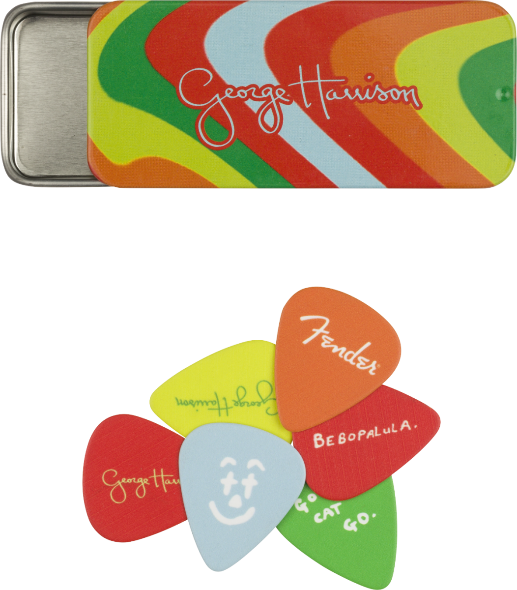 Introducing the George Harrison "Rocky" collection accessory line in psychedelic multi-color design inspired by the famous Strat.