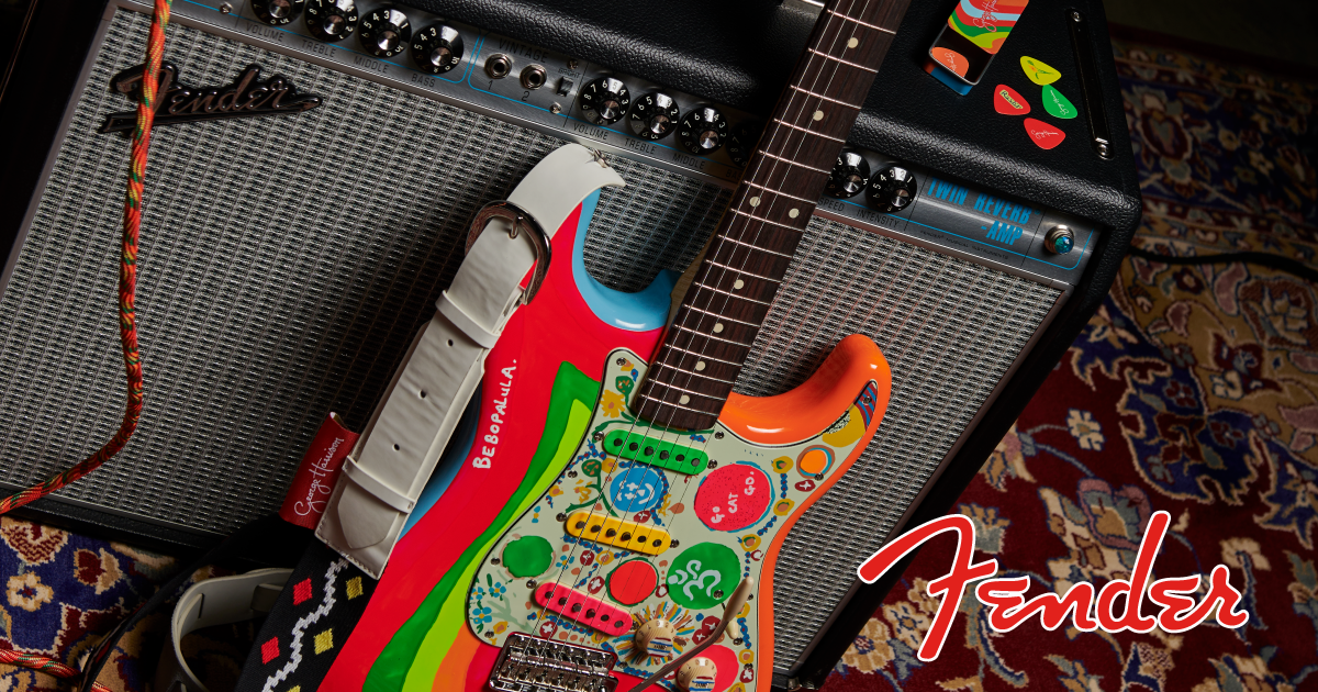 George Harrison’s impact and influence on popular music is legendary. Together with the Beatles and throughout his brilliant solo career, he crafted the soundtrack of a generation and his masterful guitar work inspired countless musicians that followed. George played a variety of iconic guitars throughout his career, but the most visually distinctive was his 1961 Sonic Blue Stratocaster hand-painted in psychedelic Day-Glo orange, red and yellow, affectionately called “Rocky.”