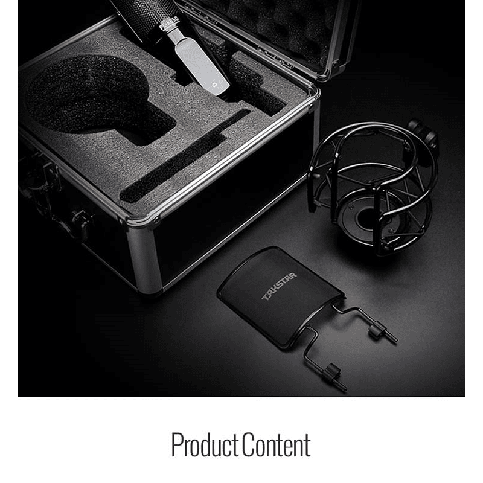 TAKSTAR K850 is a recording studio microphone equipped with a 32mm gold plated large diaphragm cartdrige. Beside an advanced research and attention to technical features a luxury and elegant piano lacquer effect mirror finishing design make of K850 a unique choice for home studio setups. Thanks to the generous 34mm large gold plated diaphragm capsule, sound reproduction is extraordinary pure: human voice can be recorded and reproduced with an incredible clear and realistic result. A rugged and stable shockmount is supplied with the microphone and prevents unwanted noise from vibrations. The microphone is supplied with an effective metal antipop filter designed to perfectly integrate to the housing and with an elegant black aluminum carring case for easy transport and safe storage. Collapse text