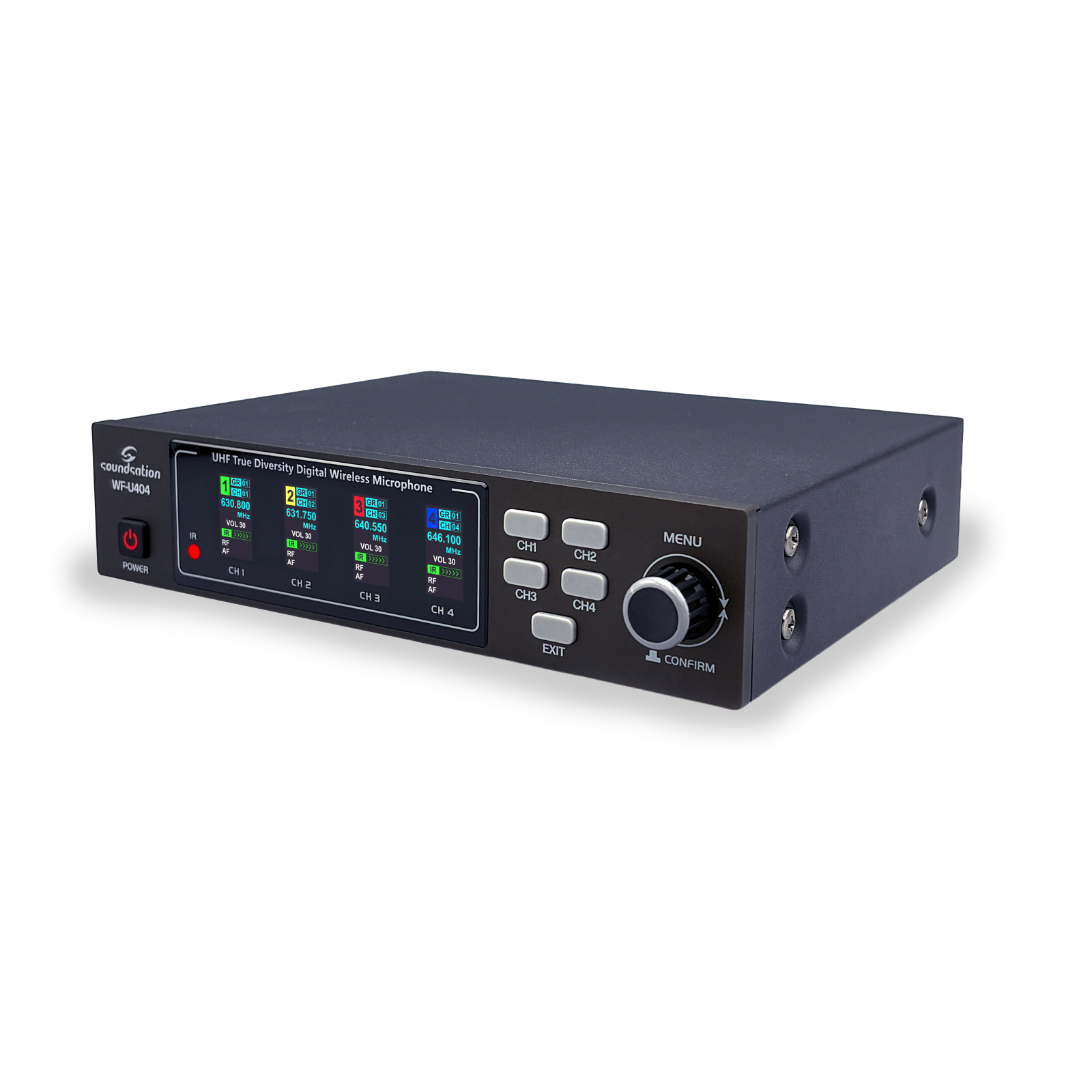 Small but mighty – that's how the new Soundsation WF-U400 True Diversity UHF wireless microphone systems are described in a nutshell. Each receiver, housed in a half-rack 19" metal case, can accommodate up to four reception channels. Each has its own color-changeable backlit display for easy recognition of the respective transmitter. A rack-mount kit also allows two receivers, for a maximum of eight channels in a single 19" rack.