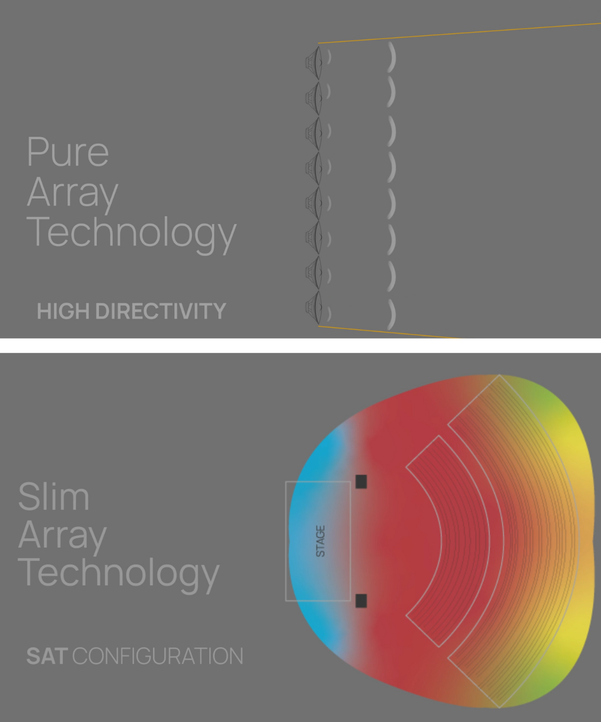 SAT® (Slim Array Technology), on the other hand, combines high sound pressure and phase coherence in a slim cabinet, ensuring powerful acoustic performance with precise long-range projection. The result is a lightweight yet high-efficiency system, perfect for professional applications that demand discreet design and superior sound quality.