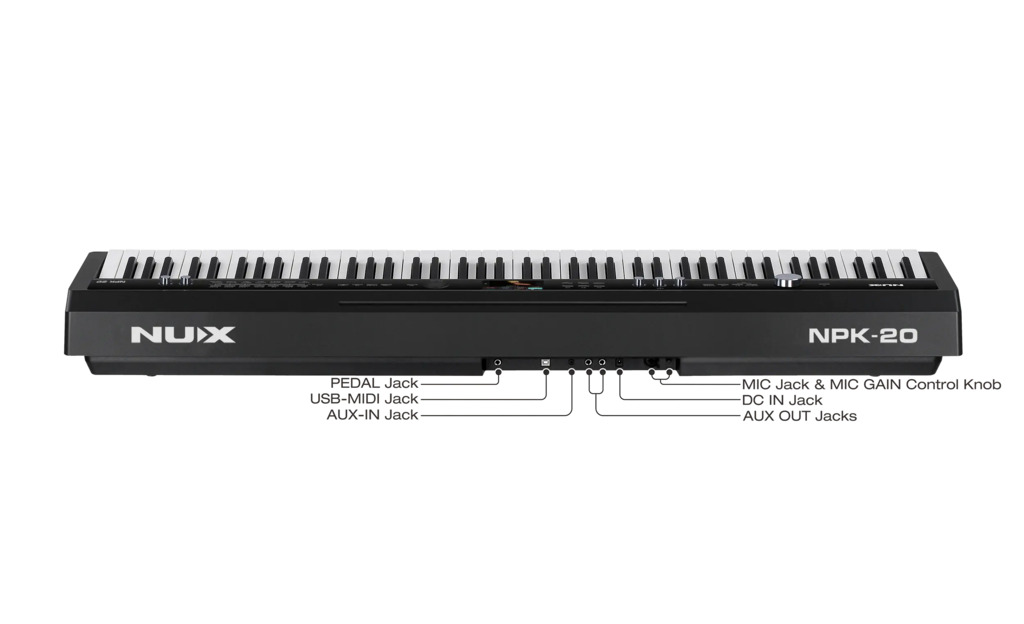 The NPK-20 also provides Aux In, Line Out (L/MONO, R), USB MIDI, 2 Headphones Outputs, Damper Pedal Jack, and Pedal-Unit Jack, perfect for various performance applications.