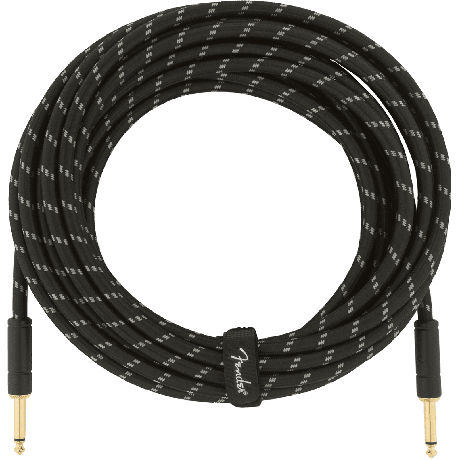 Fender Deluxe Series cables carry the highest quality materials and braided shielding to deliver flagship durability, conductance and transparency. Our top-of-the-line cables sport custom molded ends with strain relief under the housing—plus 24K gold-plated connectors that won’t tarnish or degrade your sound over time. These cables use a very quiet braided shielding that is engineered to maximize the purity of your tone, and they’re protected by a soft-woven yet rugged tweed jacket that provides ultimate protection with classic Fender style. Available in 6", 1', 3', 5', 10', 15' (4,5 m) , 18.6' (5,5 m) and 25' (7,5 m) lengths.