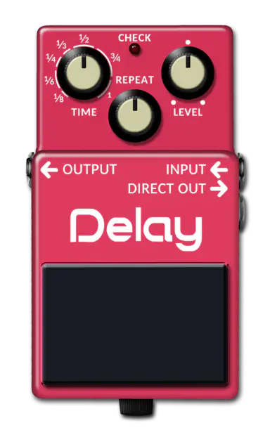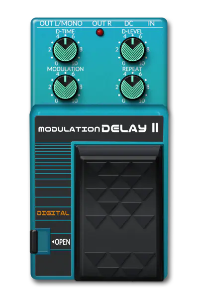Modulation Delay is based on the Ibanez DML modulation delay. The Chorus gets lush and rich, not at all what you would expect from an ancient digital pedal. Holding the footswitch enters Alt mode (the LED indicator will flash ORANGE.), then the Repeat knob will edit the Mod parameter of this delay. Short press the footswitch again to quit Alt mode.