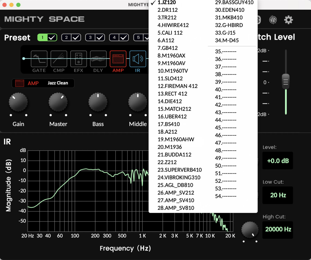 You can use a wide range of factory IR for guitar, bass, acoustic. And you can also load 3rd parties IR via software.