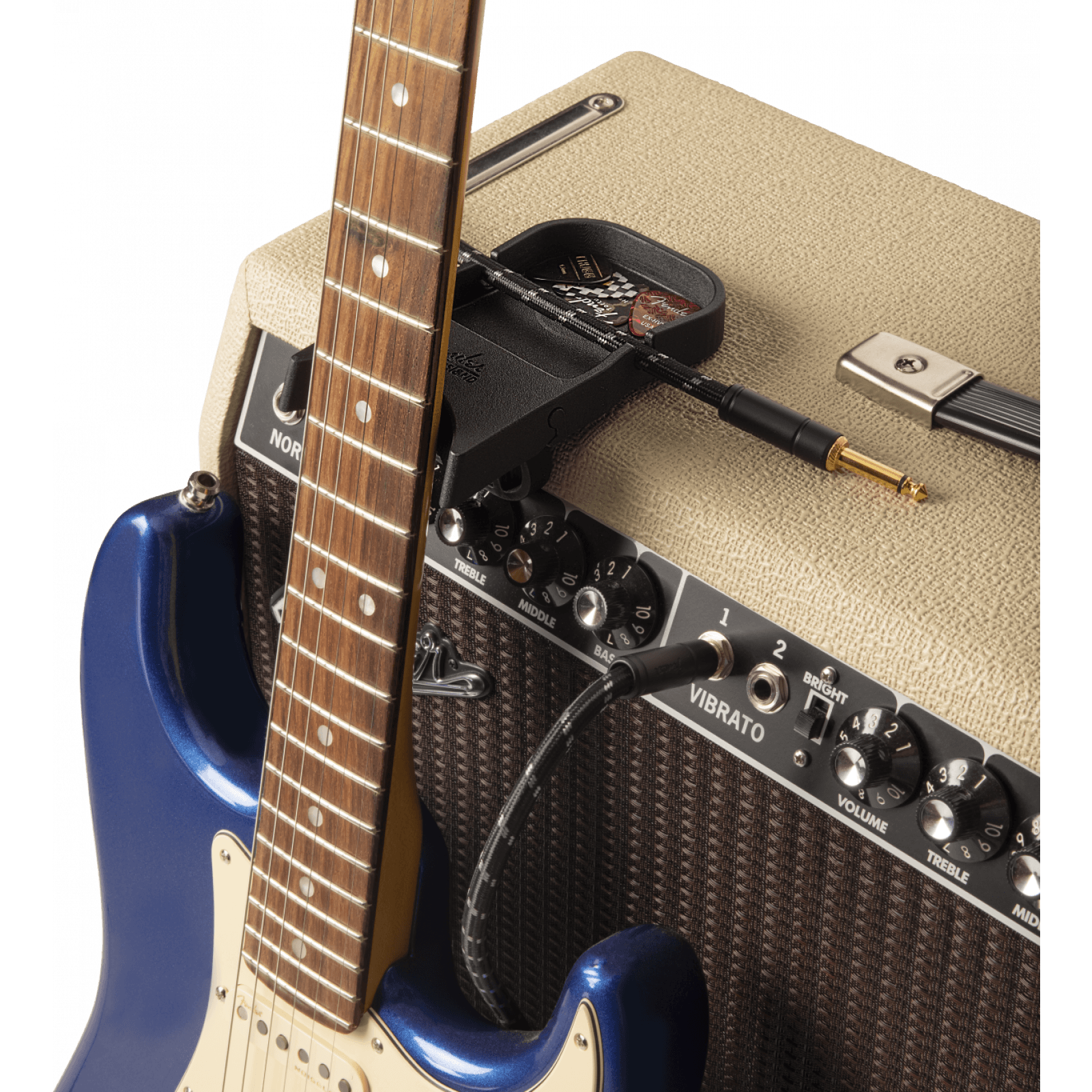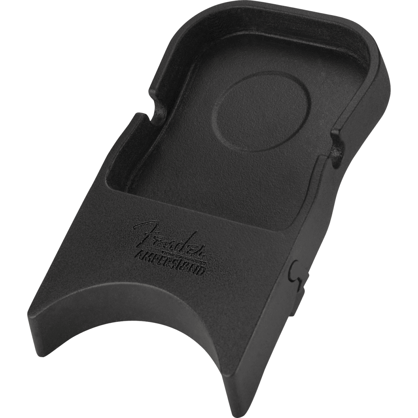 The Amperstand Guitar Cradle transforms any amplifier or tabletop into the perfect place to set your guitar down without fear that it will fall. The bottom of the Amperstand Cradle is covered in a mirco-suction material that will safely grip just about any surface, including amplifier tolex, creating a secure seal that will hold the cradle in place to give you peace of mind. The Amperstand Cradle also provides a classic Fender “ashtray” to convenient place to hold small items like picks and a capo or your favorite beverage. The two grooves on the sides will hold your guitar cable in place.