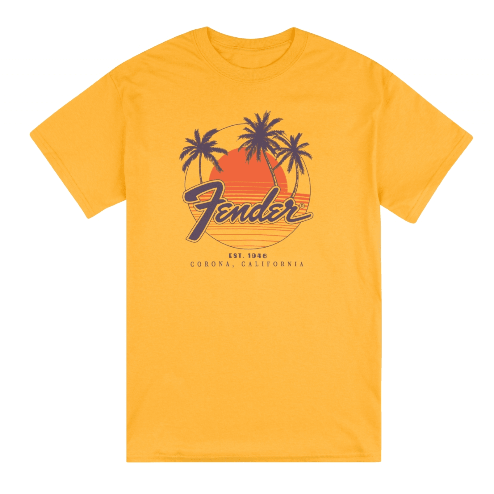 Get to the show in contemporary Fender style with this t-shirt. Featuring the Fender® logo over a sunshine and palm tree design, this 100% cotton shirt is the best way to show your love for our Corona, Calif. factory.