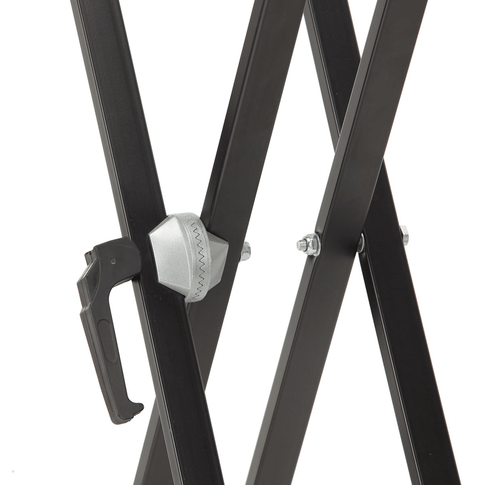 KS-25 is a double keyboard stand built in steel. Sturdy and stable, fits all kind of keyboards to medium workstations and digital pianos. Height can be adjusted quickly and easily thanks to its mutliple positions "easy adjsut" mechanism. Adjustable ovalized rubber feet ensure optimal stability.