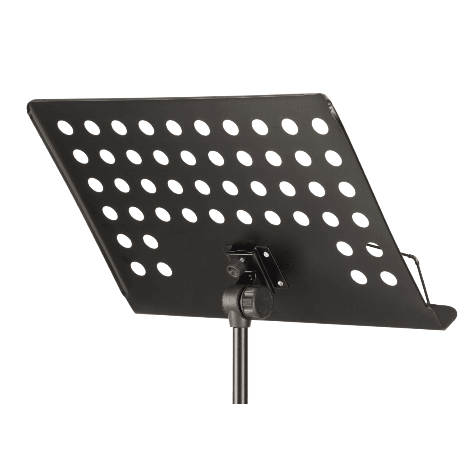 Orchestra music stand with "bayonet style" removable perforated plate and nylon bag