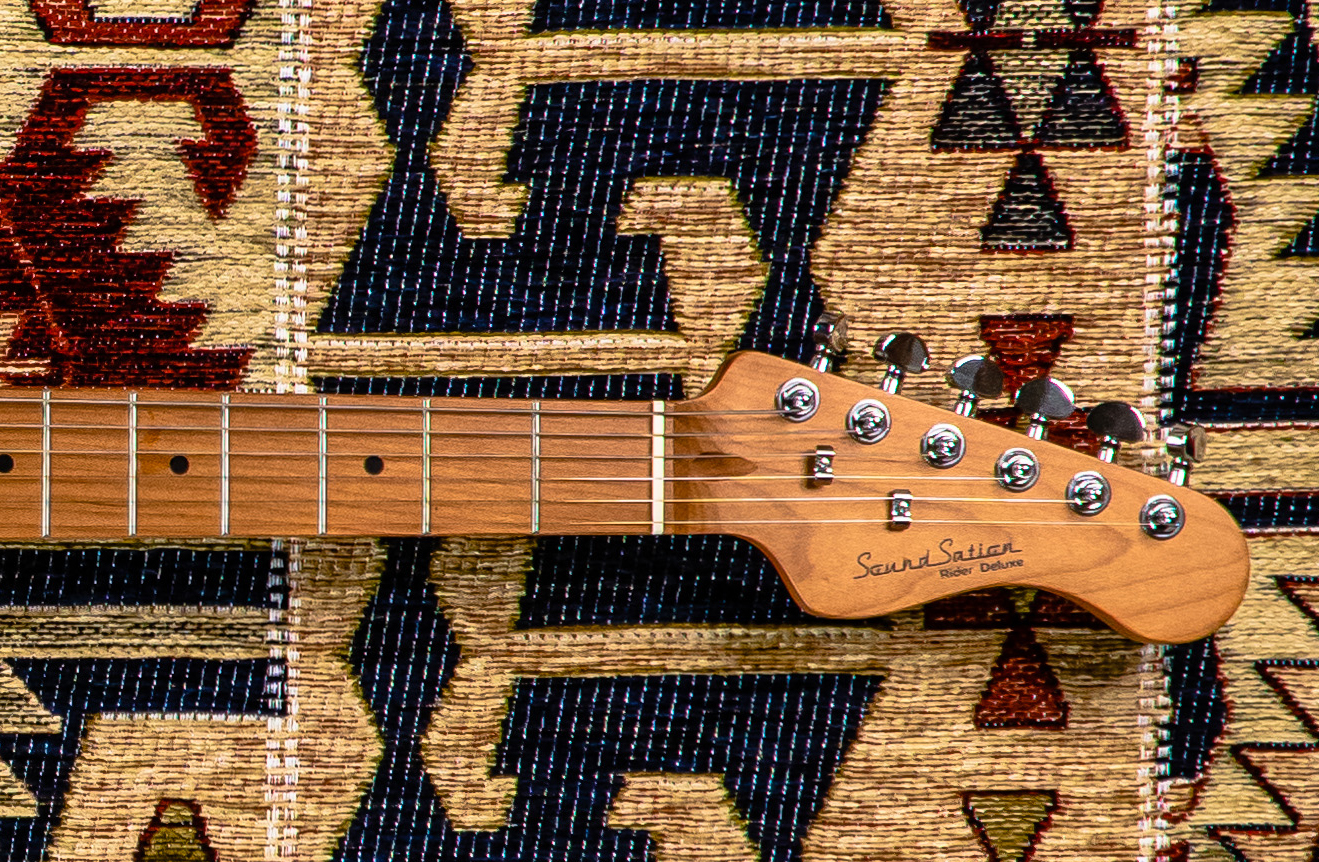 RIDER DELUXE v2: here it comes the upgraded version of an incredible series gathering the alder sonic feature enriched by a flamed maple top, the stunning look and feel of roasted maple, the original Wilkinson pick ups/bridge, the hi-quality self locking machines heads.