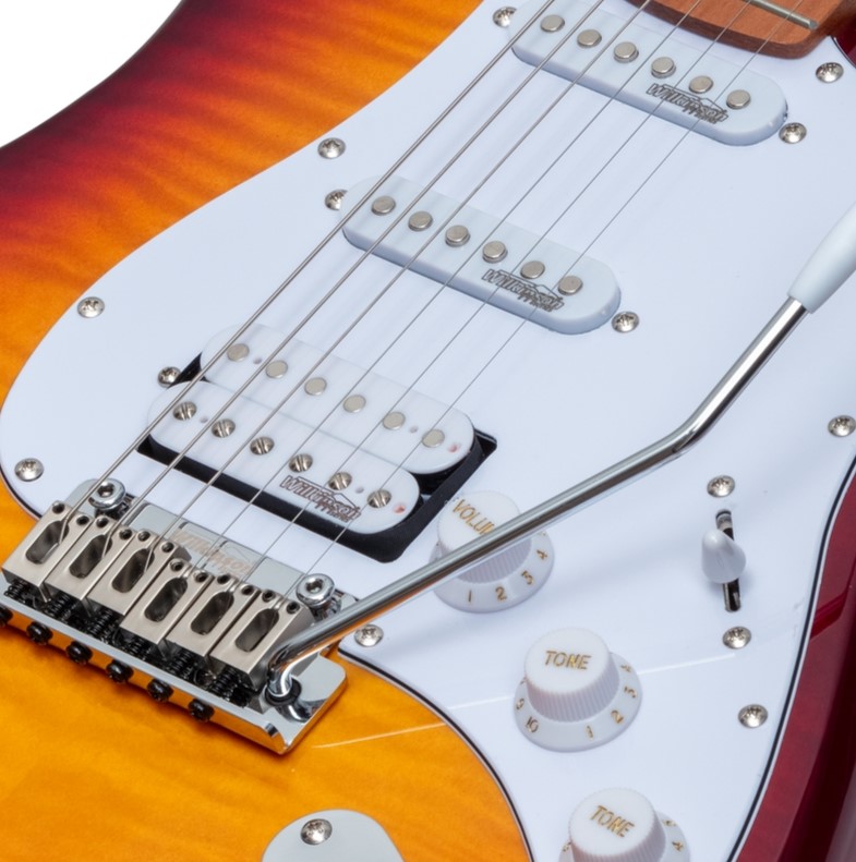 Wilkinson® 2 point bridge and Wilkinson® single coils/splittable humbucker add great value and versatility.