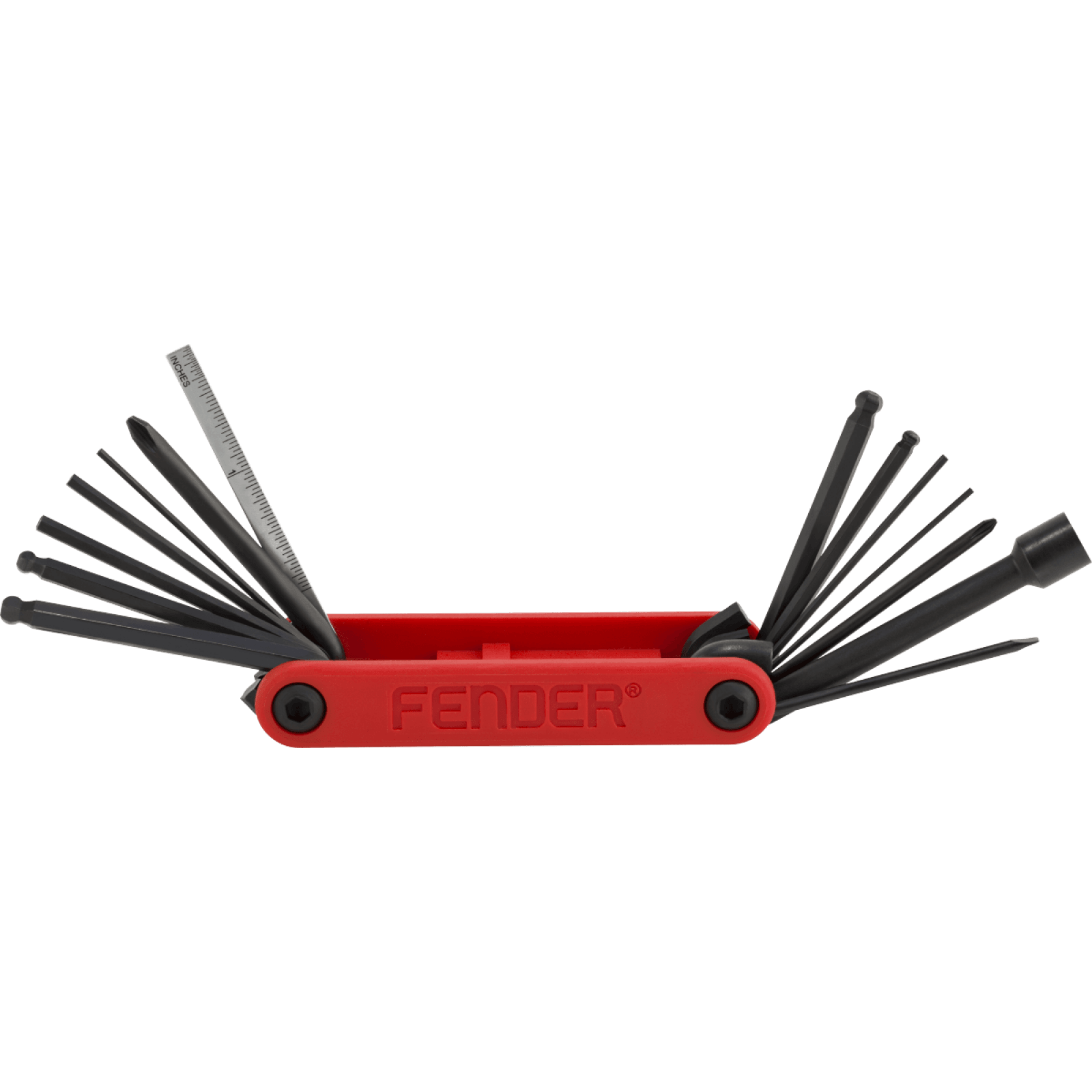 Fender's Guitar & Bass Multi-Tool is a 14-in-1 compact tool designed for use with Fender models as well as virtually any other make or model. Its one-piece body allows for ease of use and rotation while the included truss rod size hex wrenches are ball end for easy access. Featuring standard and metric sizing, this multi-tool serves as a toolbox in your pocket, providing maximum functionality for all of your instrument repair and tech work needs. Collapse text
