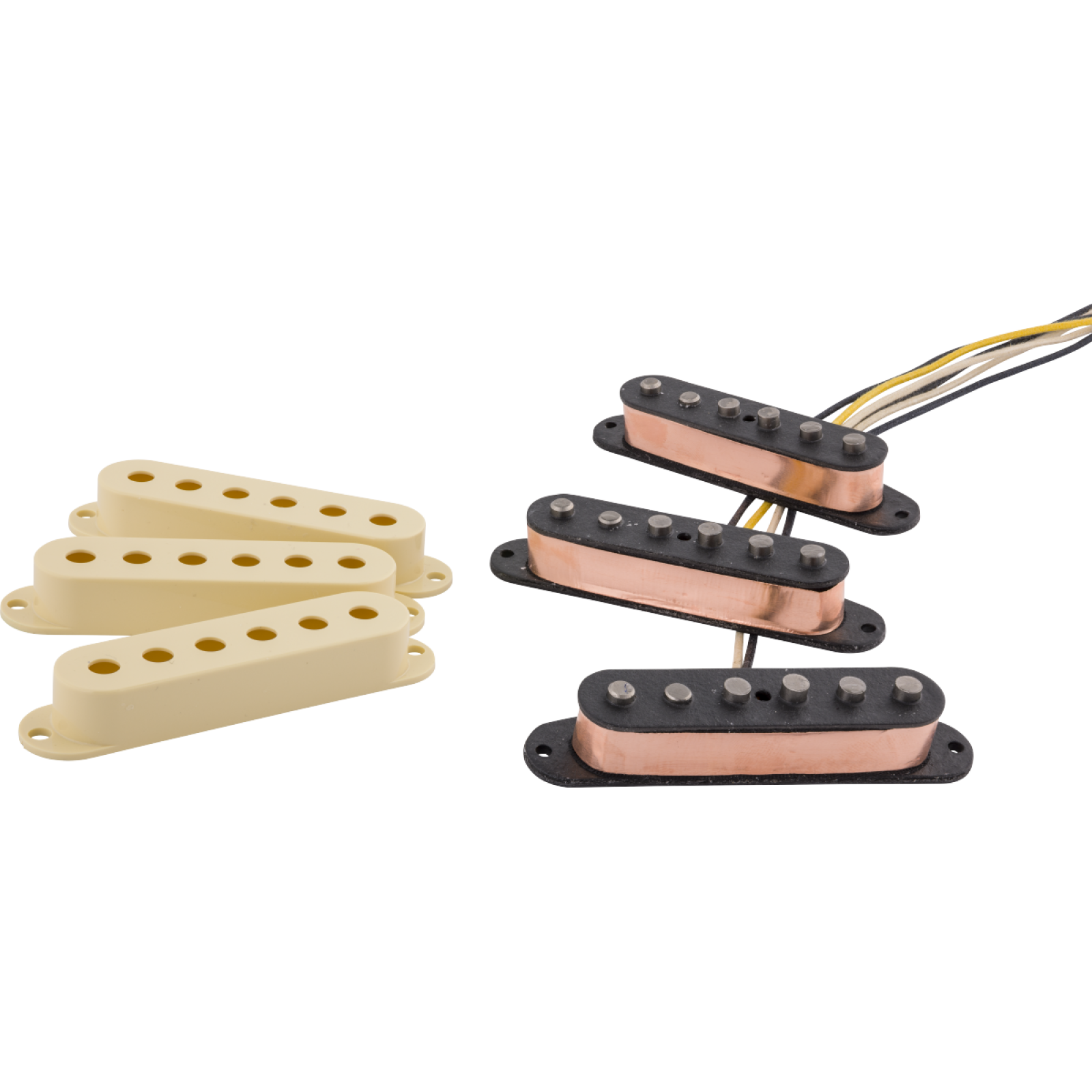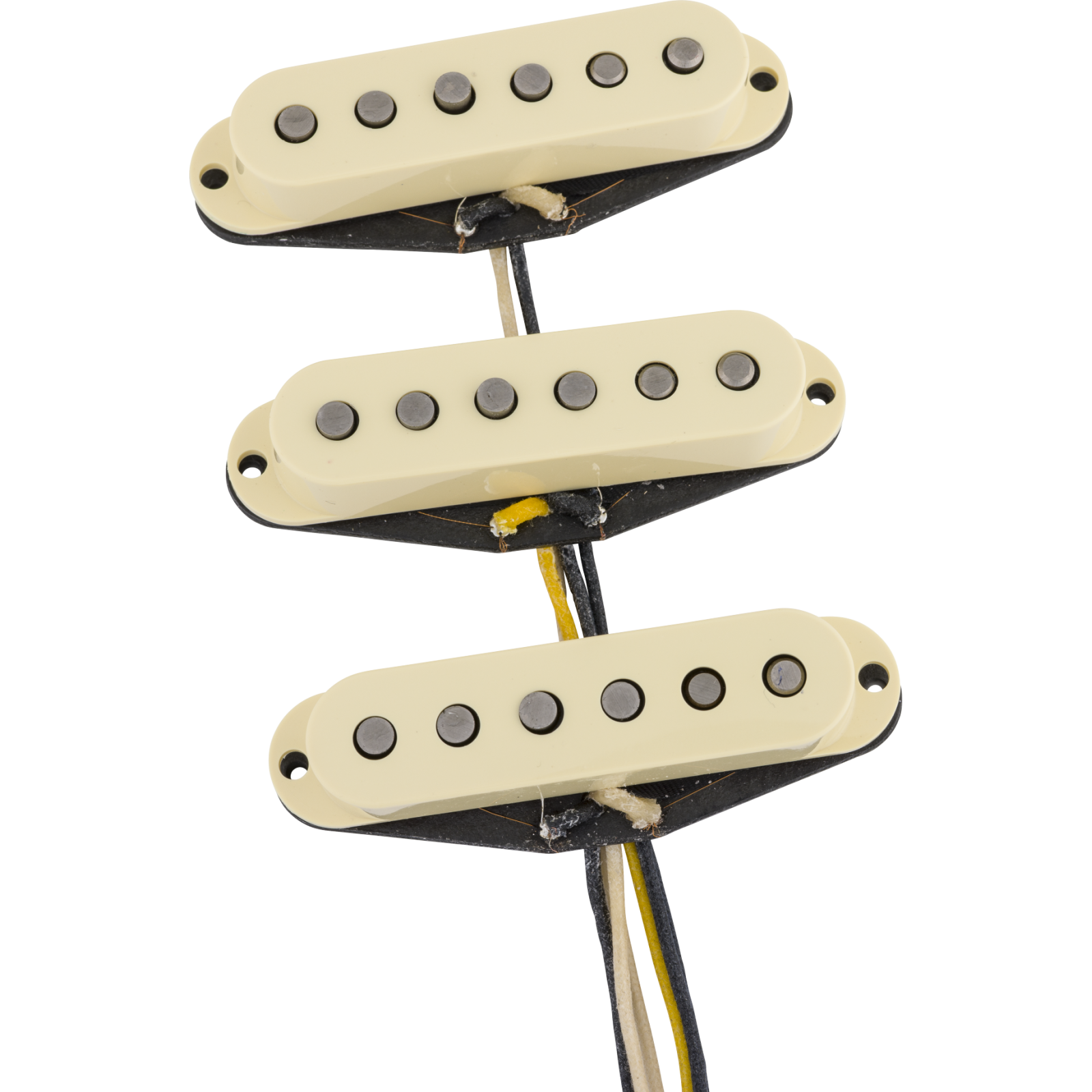 Fender® Custom Shop Dual-Mag II Stratocaster® pickups produce well-balanced tone with shimmering, clear highs and rich lows courtesy of a mix of alnico magnets. Featuring unbeveled alnico 5 magnets from the low E through G and hand-beveled alnico 2 magnets for the B and high E. Additionally, each pickup is wrapped with copper shielding tape to reduce noise.