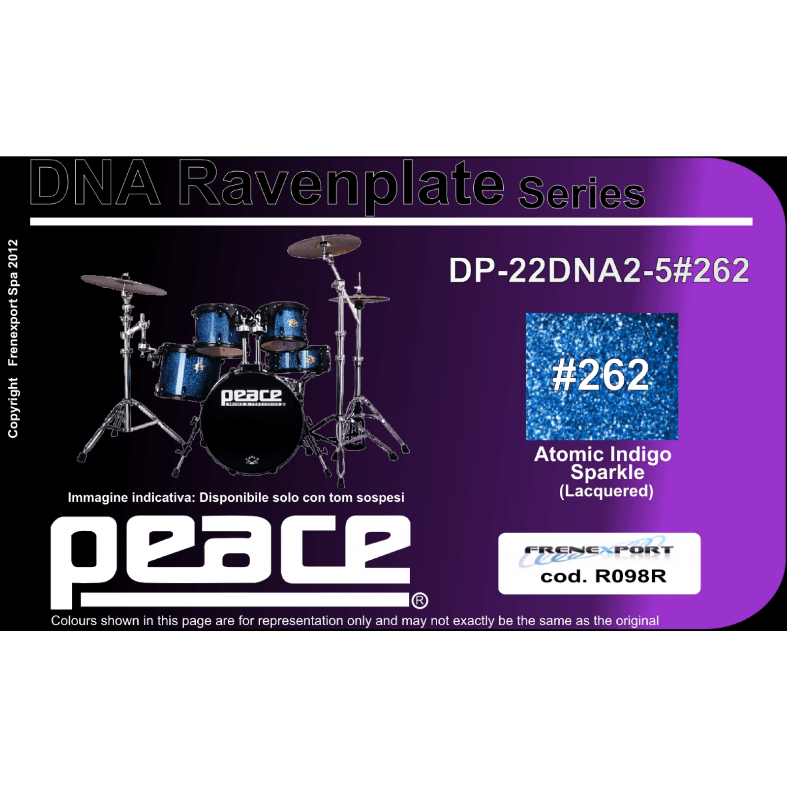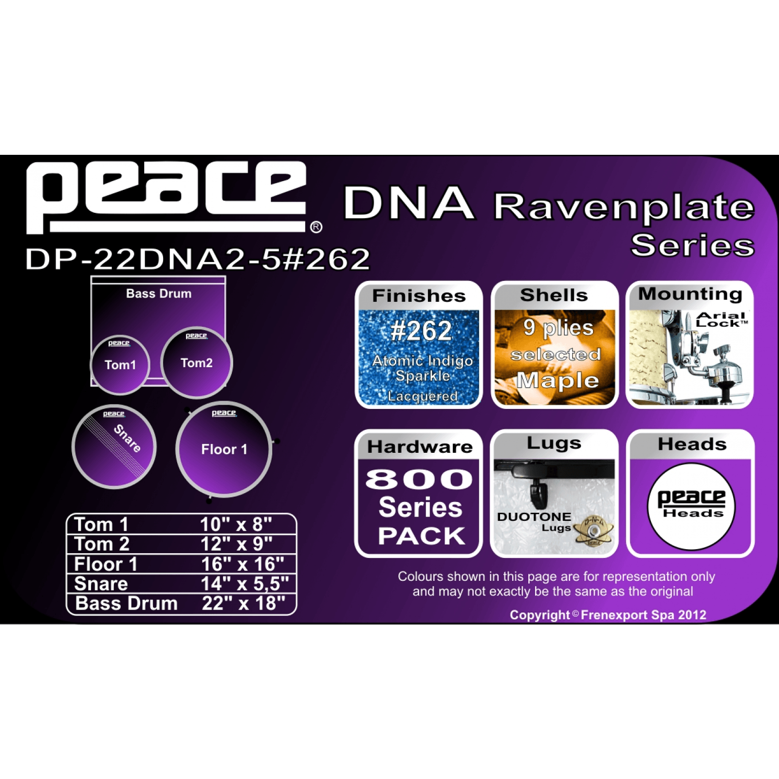 Peace’s top-of-the-line package kit, the DNA series resides at the crossroads of rugged and handsome, where professional quality meets affordability. A versatile kit designed to capture the quintessential modern drum set sound, the DNA series combines heavy duty series 800 hardware including both a straight and a boom stand, and 9-ply lacquered North American maple drums in a package that includes rims-mount toms, low-mass lugs, die-cast claws, and brass vents, among many stand-out features. The series is offered with chrome or black-trim hardware, and custom sizes and finishes are also available by special order. It ain’t broke, so we didn’t fix it. Peace’s DNA series has been a preferred choice by artists and endorsers for years, and it’s been heralded as “a pro-level kit at a very affordable price” by DRUM! Magazine. Shown in one of Peace’s new finishes, black castle, a three color sparkle lacquer finish with a triple sparkle overlay belt that explodes chards of color under stage lighting. Collapse text