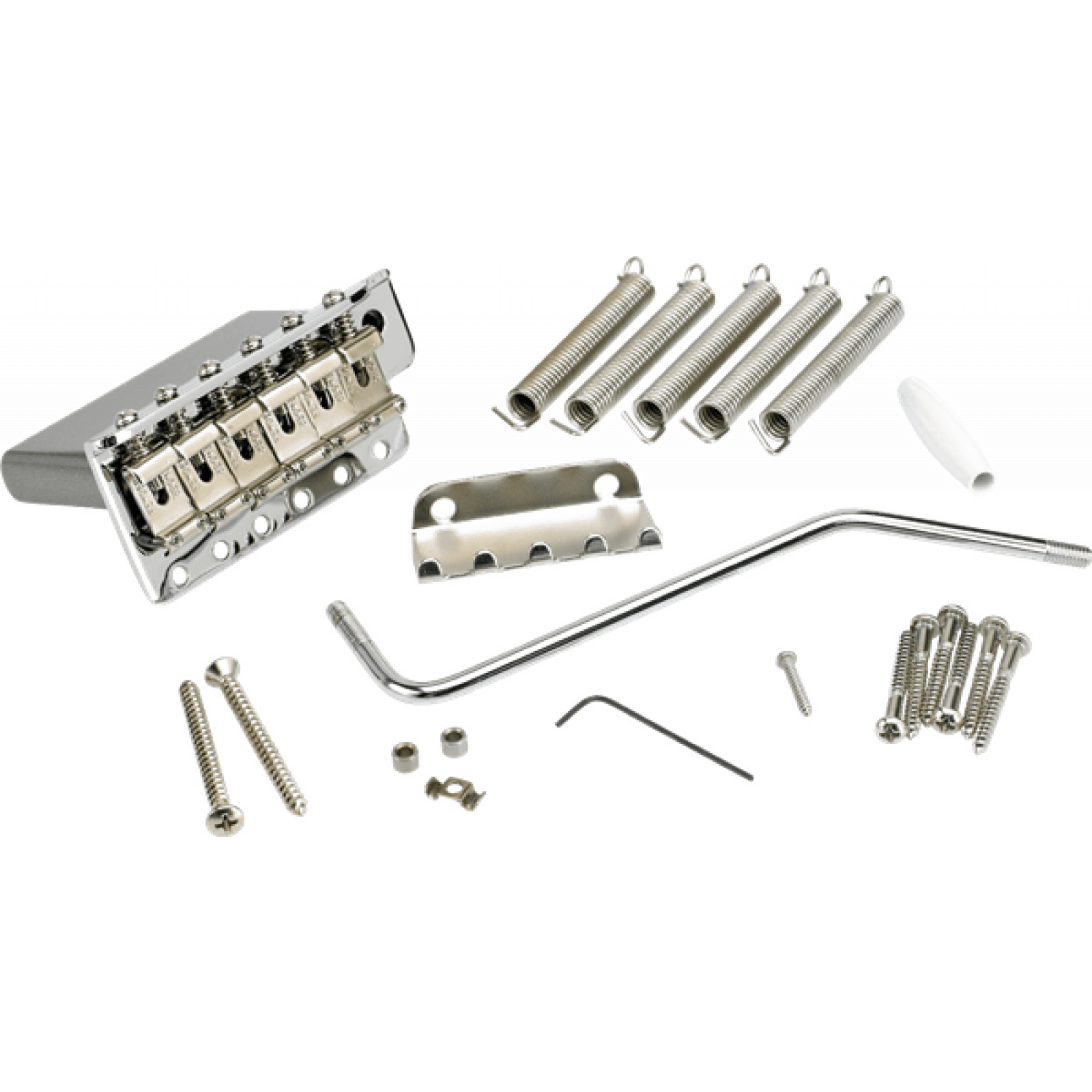 Vintage-style tremolo bridge assembly for use on left-handed American Vintage series Stratocaster models. Includes six "Fender"-stamped bridge saddles with mounting screws, tremolo claw, tremolo springs, tremolo arm with tip, tremolo arm tension spring, string tree, .050 hex adjustment wrench and mounting screws.