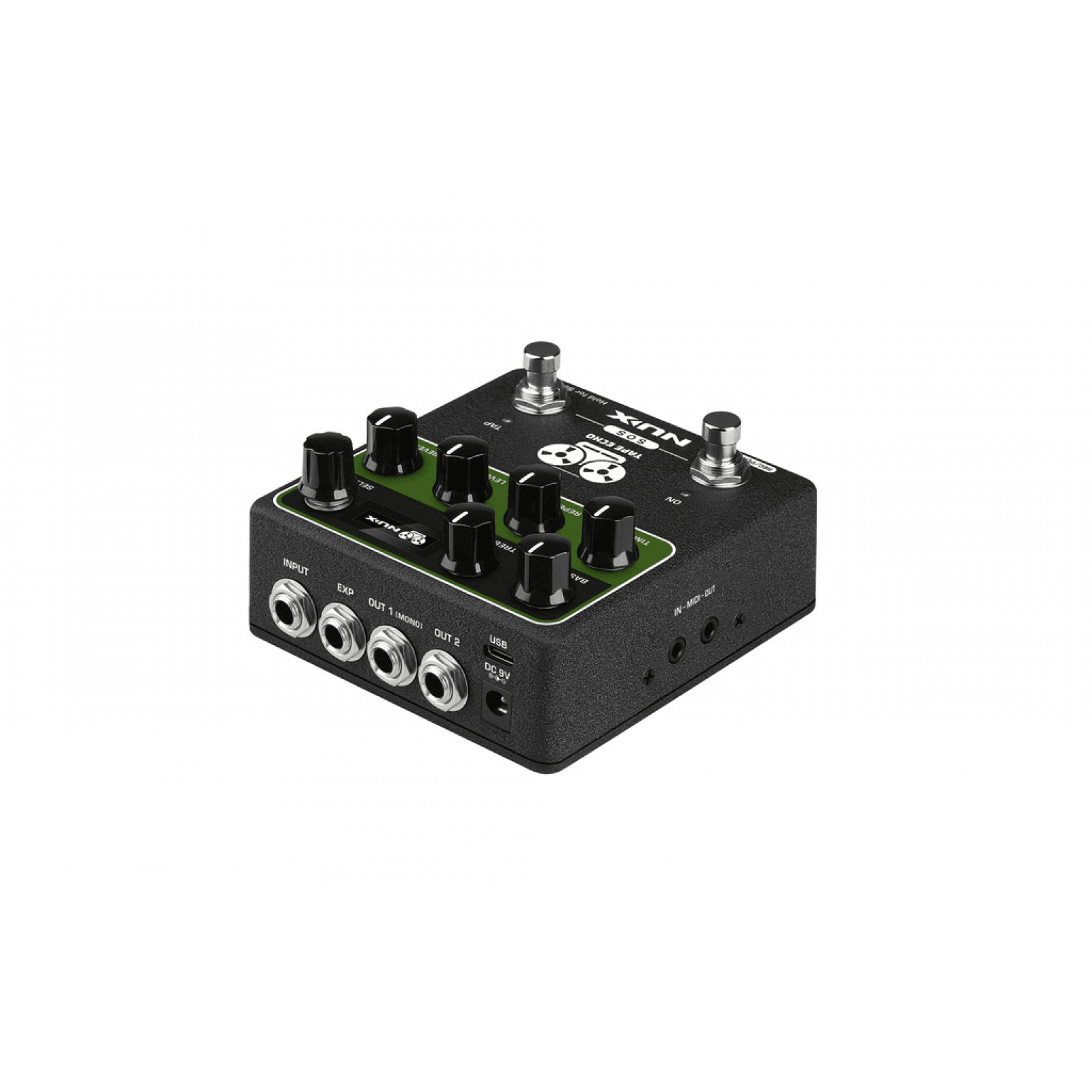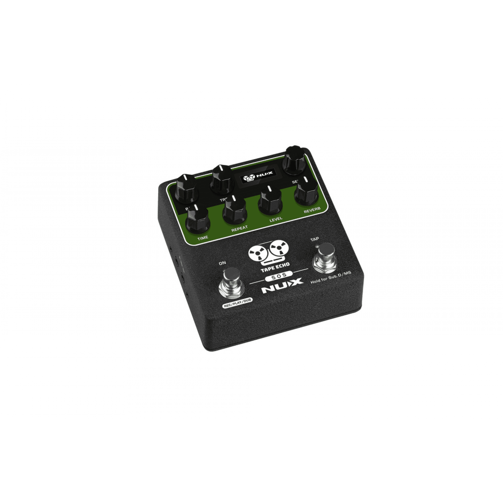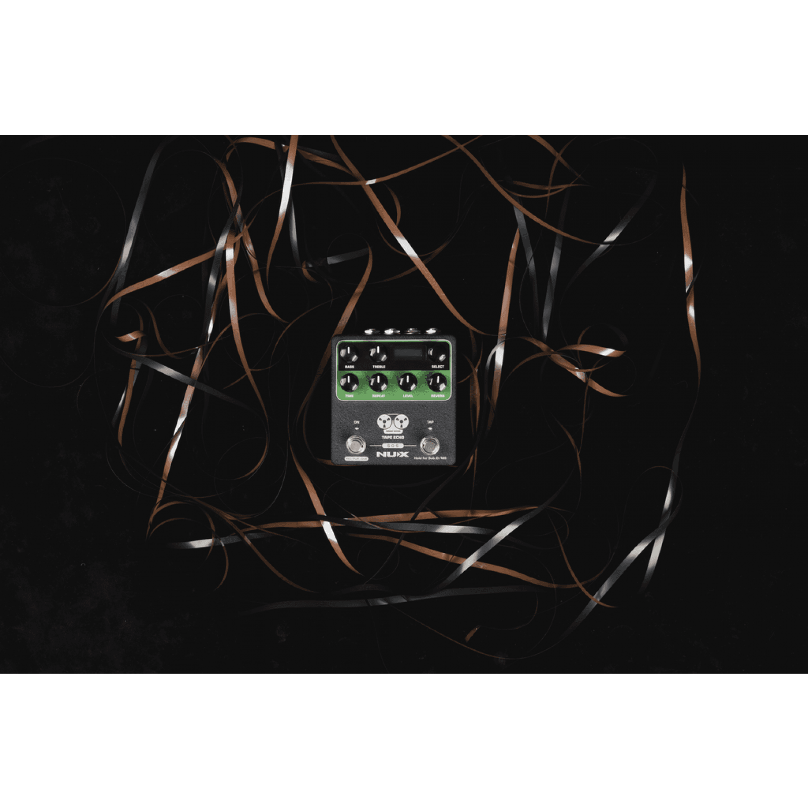 NUX TAPE ECHO uses Core-Image technology to capture the Japanese Space Echo characteristics including BASS, TREBLE, REPEAT RATE (TIME), INTENSITY (REPEAT), ECHO VOLUME (LEVEL), REVERB VOLUME (REVERB), and physical features like WOW, FLUTTER, SATURATION.