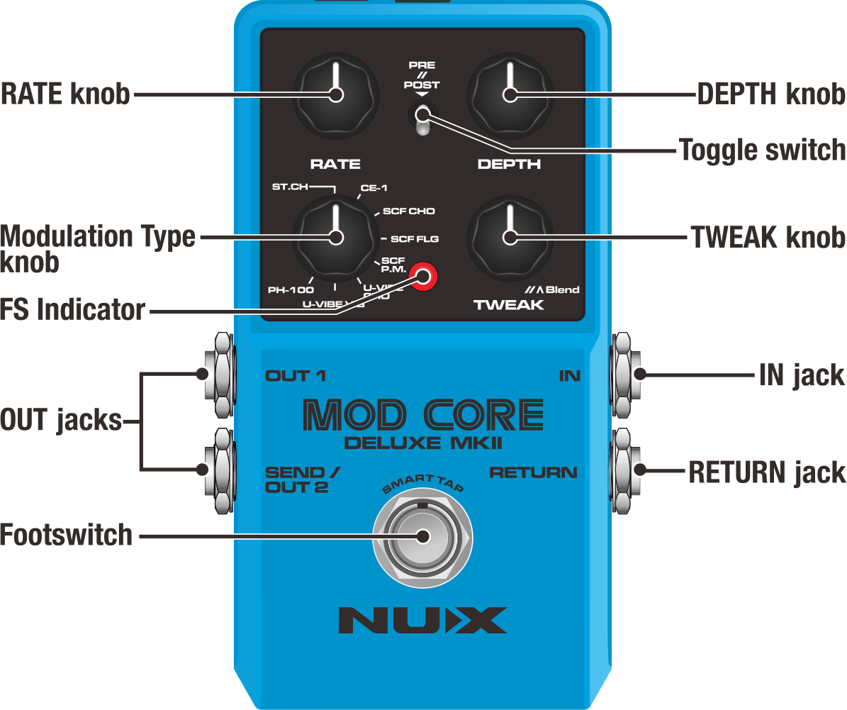NUX's successful CORE DELUXE series upgrades to MKII version, reaching new standards in terms of technology and flexibility of use. Each pedal is designed to give the guitarist a true sonic arsenal through a few easy and intuitive controls, smartly arranged in the space of a single compact stompbox.