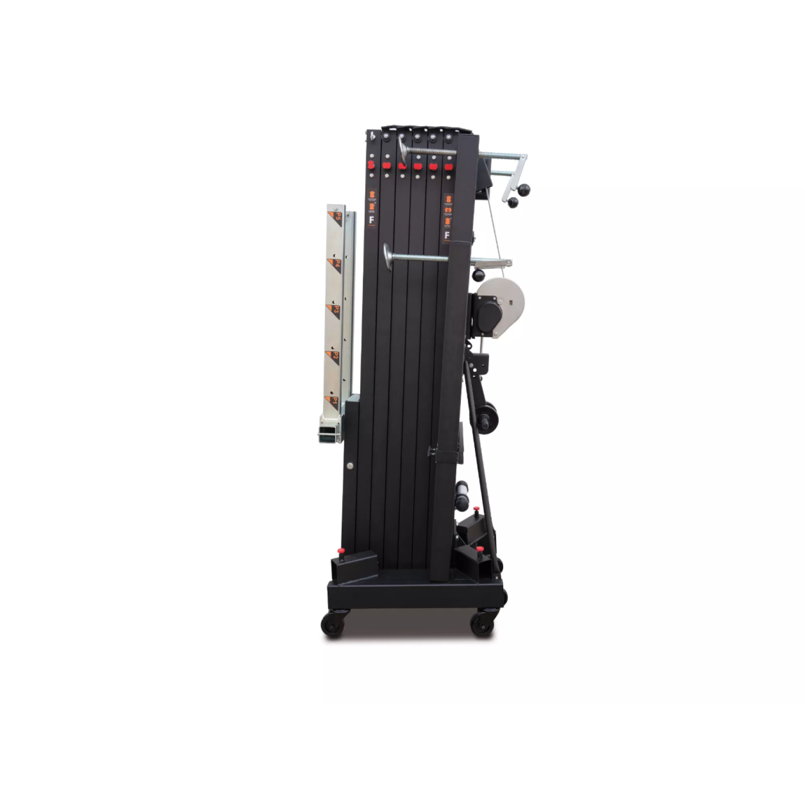 Front load lifting tower with a maximum height of 8 meters. Able to lift up to 450 Kg in its normal mode and 700 Kg in its structural model. Its Dynamic Overlap system evens the stresses across all the aluminum profiles, improving their resistance and reducing deflexion.