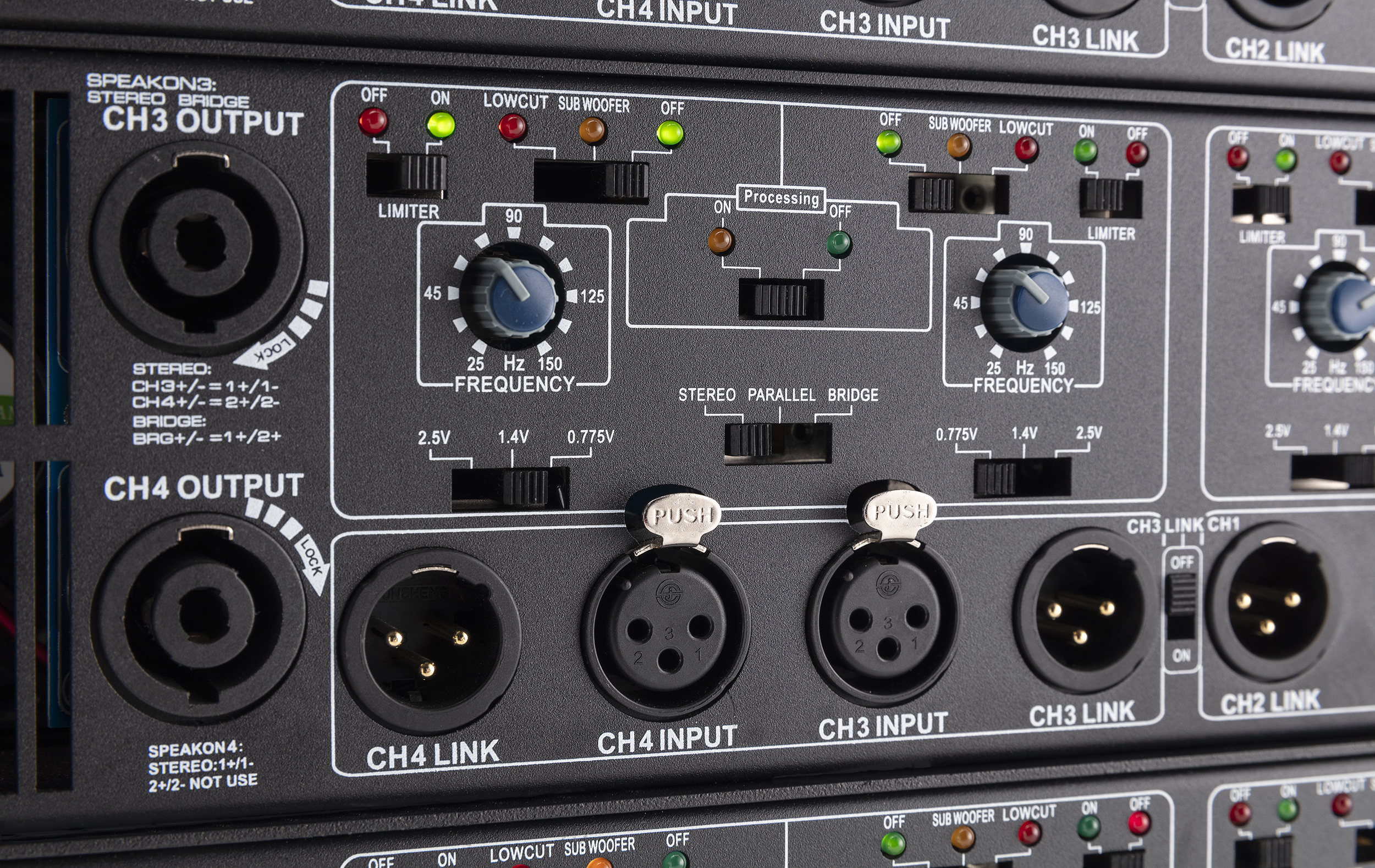 Each channel integrates a crossover with a low-pass filter, for use with both full-range systems and subwoofers, without the need for external processors. The protection system includes the signal limiter, on-off muting, DC-offset detection, thermal protection, and current limiting. The cooling system is extremely efficient and controls the speed of the two fans in order to ensure excellent noise reduction.