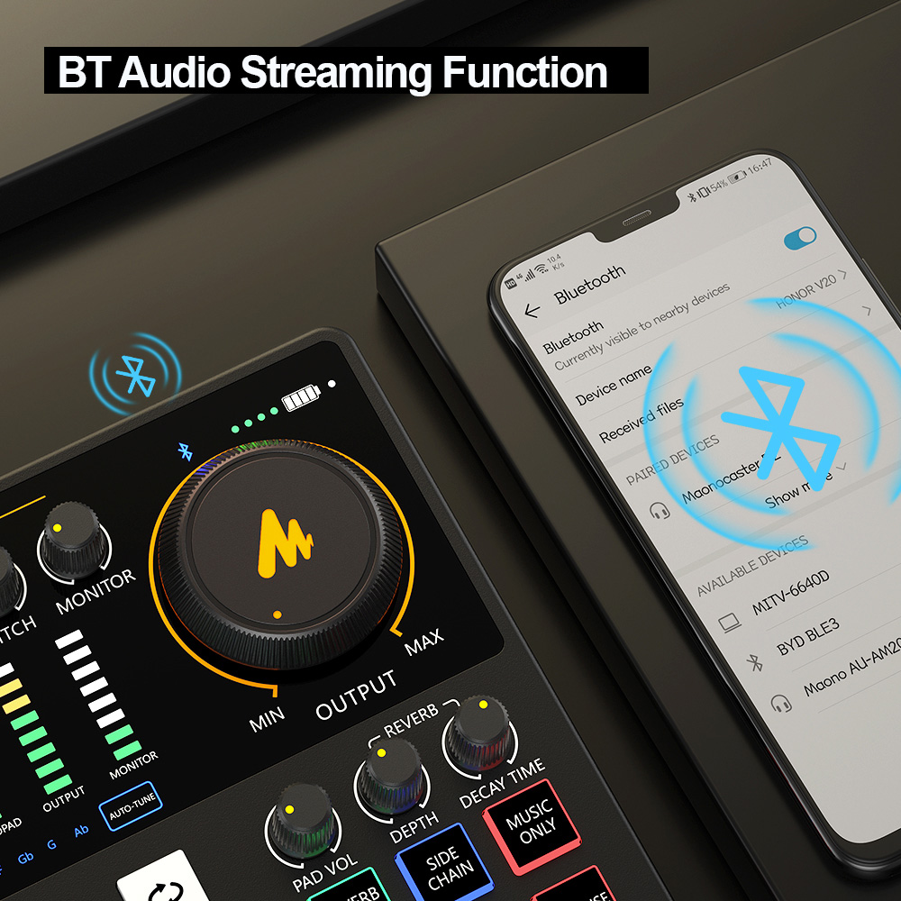 This podcast console has a BT audio streaming connection function that allows wireless connection to devices such as smartphones for applications with live music accompaniment.