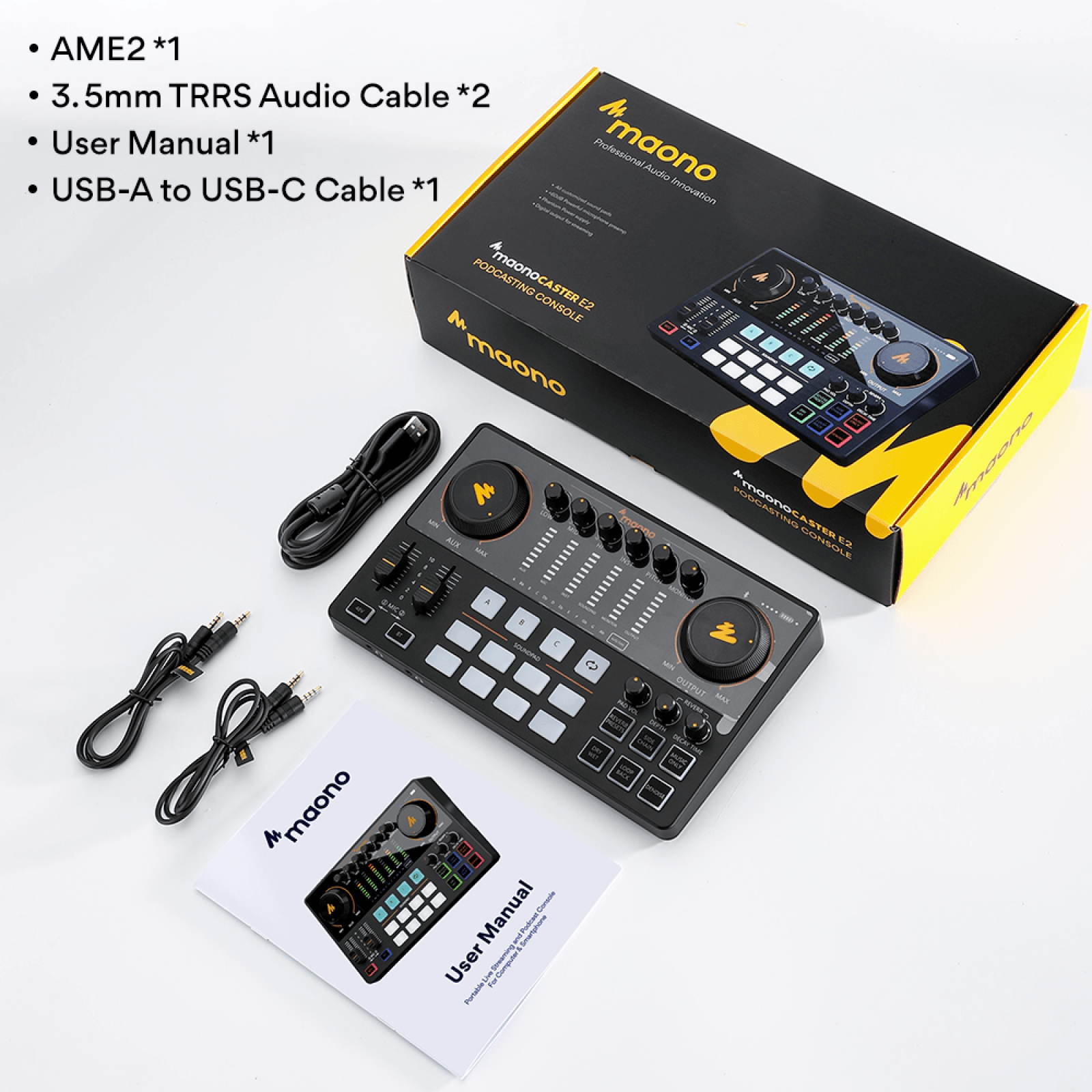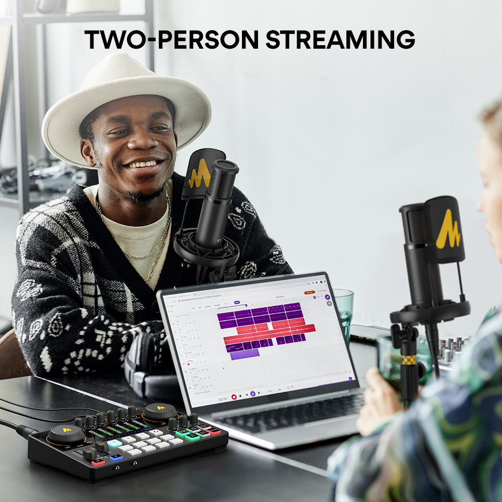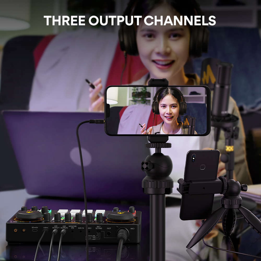 This podcast console has 2 analog and 1 USB audio output channels that allow simultaneous connection with 3 streaming devices.