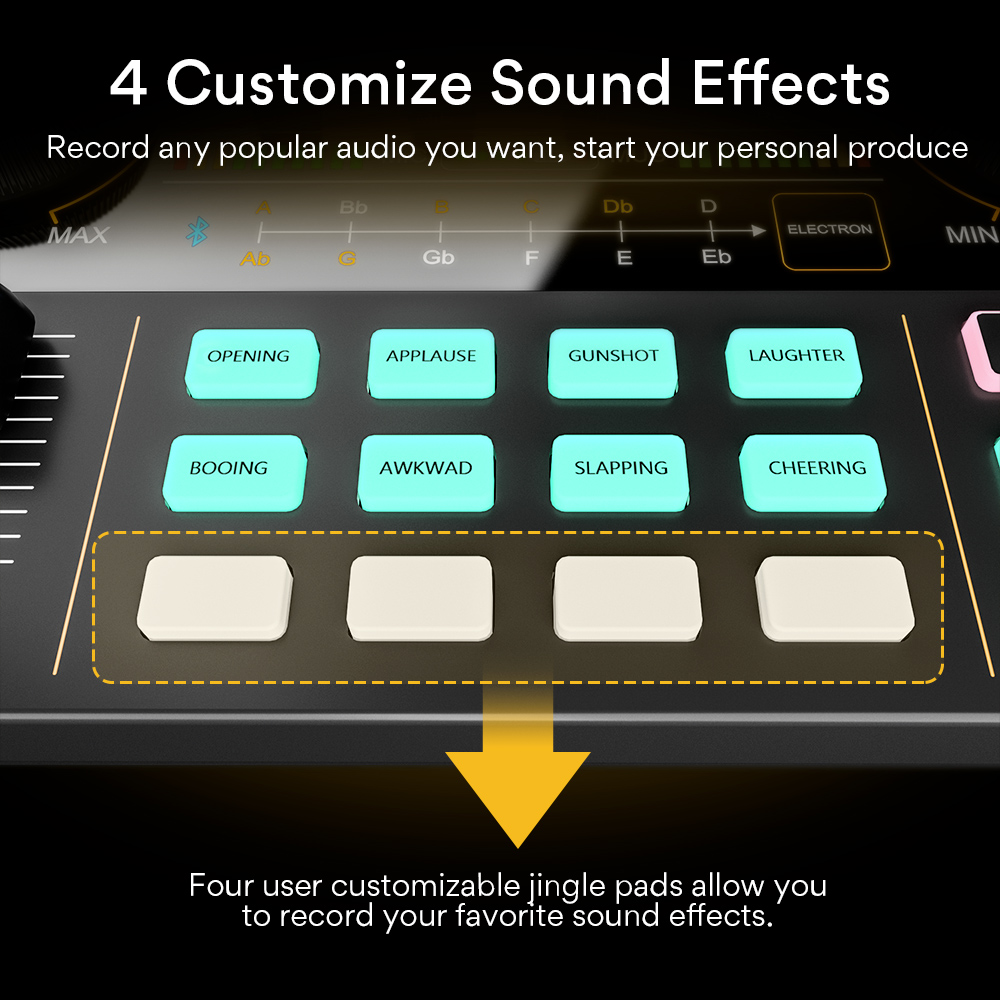 This podcast console offers users the possibility of having 4 customized sound effects that can be activated using the appropriate buttons located on the control panel. Users can record audio clips and import them into the podcast console via a microphone, external audio source, or Bluetooth device to use these sound effects in live broadcasts.