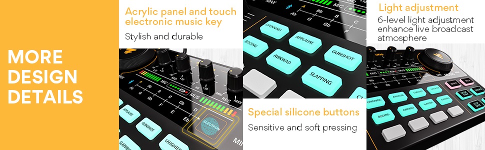 The acrylic panel, the attention to detail and the silicone and touch buttons make the MAONOCASTER LT AU-AM200-S1 console elegant and resistant. The lighting adjustment of buttons and pads with 6 levels of intensity enhance live broadcast atmosphere.
