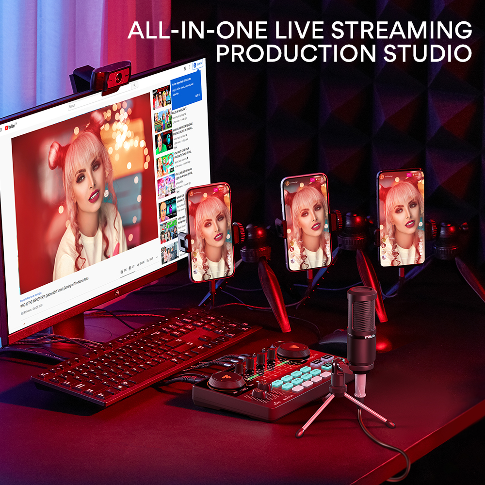 The built-in DSP digital audio processor allows you to vary your voice and add multiple sound effects to your podcast with a single button, which will make your live stream more fun.