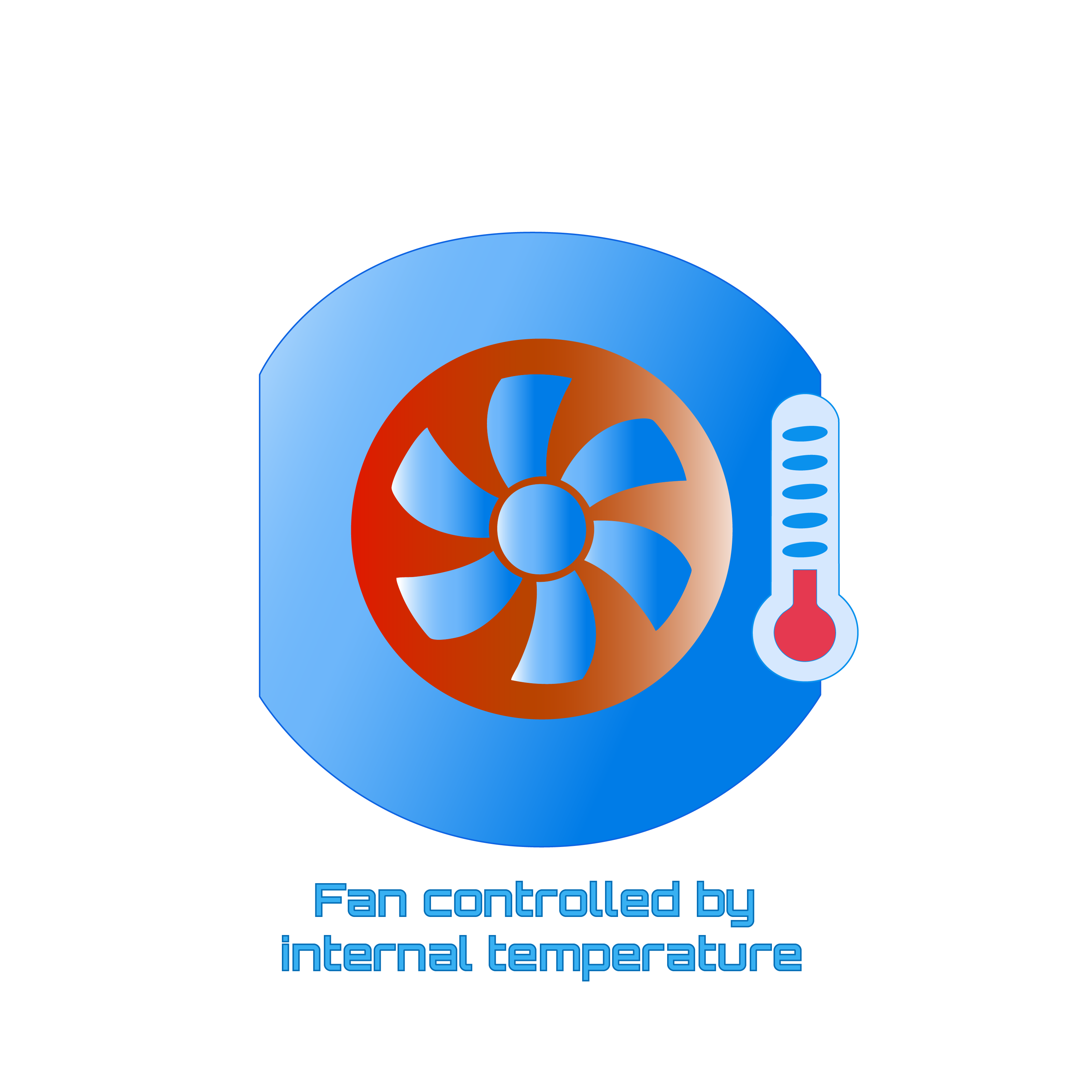 Ventilation is controlled by internal temperature, with front-to-rear airflow for rack mounting.