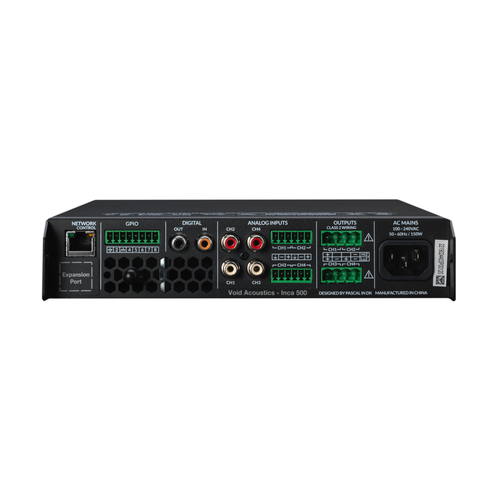 The Inca 500 is a four-channel amplifier in a half-rack width format, designed to deliver maximum installation flexibility for Lo-Z and Hi-Z systems alike. Thanks to its universal power supply with integrated PFC and 1 RU height, it’s perfectly suited for AV installations, hospitality, corporate environments, and distributed systems. It can deliver 125 W per channel at low impedance (4–8 Ω) or 250 W per channel at 70/100V, making it ideal for mixed or distributed setups.
