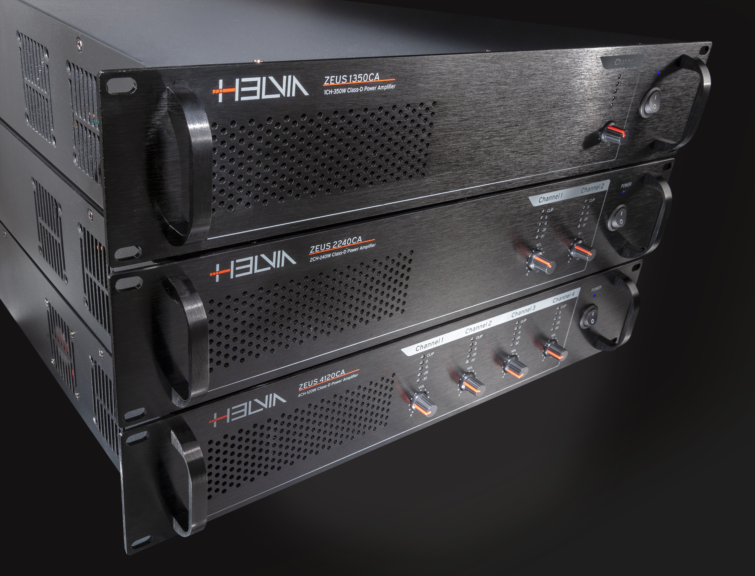 Helvia Zeus CA series is designed for the world of small-medium commercial audio systems, both on 70V or 100V constant voltage lines, and low-impedance lines from 4 to 16 ohm. It offers 1, 2 and 4 channels Class-D amplifiers with 120W, 240W and 350W RMS powers.