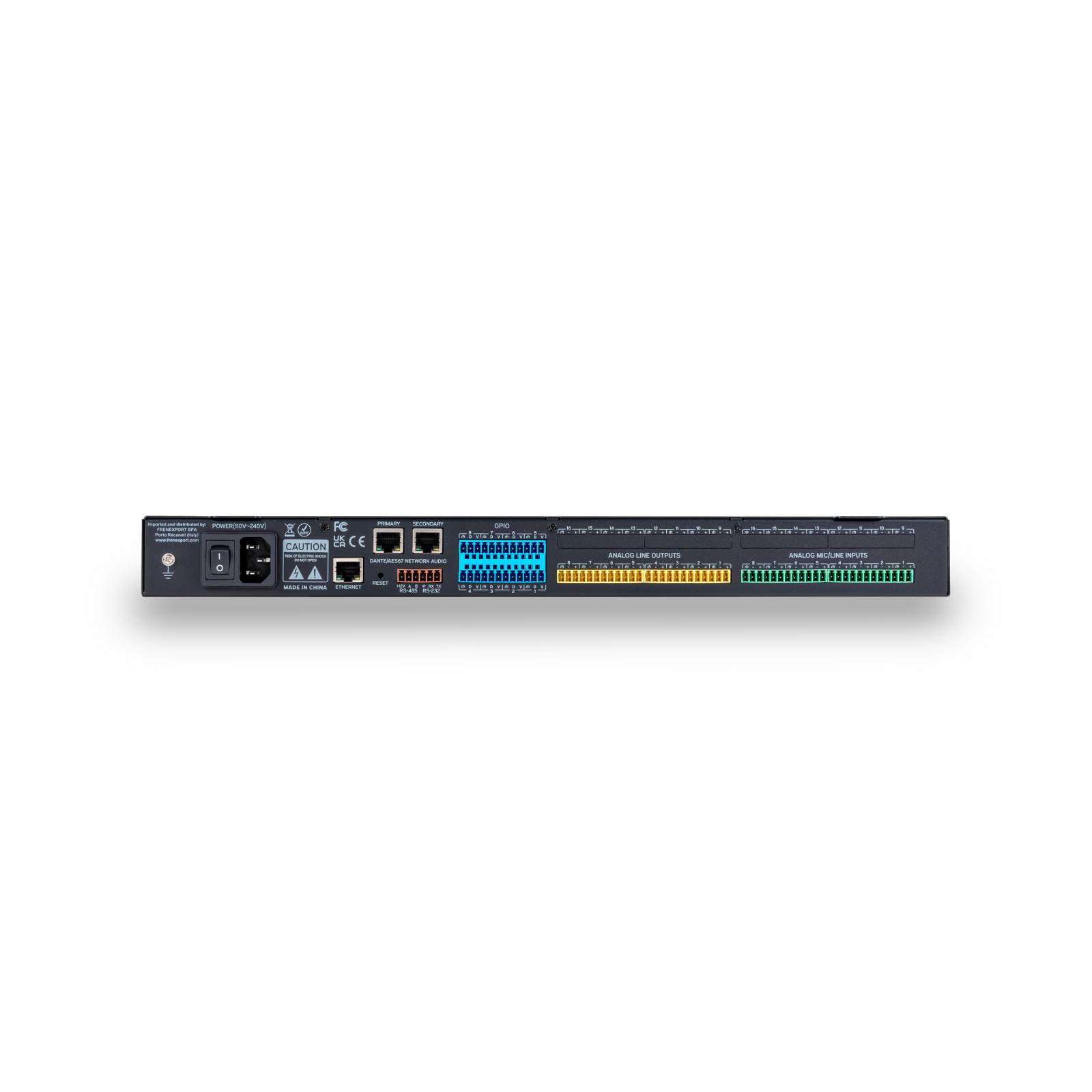 Every analog or Dante input comes equipped with a suite of powerful processing tools, including a Compressor, Expander, Auto Gain Control, an 8-band Parametric EQ, and an 8-filter Feedback Suppressor (static or dynamic). On the output side, analog and Dante outputs feature Crossover filters, 8-band Parametric EQ, delays up to 1200 ms, and limiters, ensuring precise control over the audio signal at every stage.