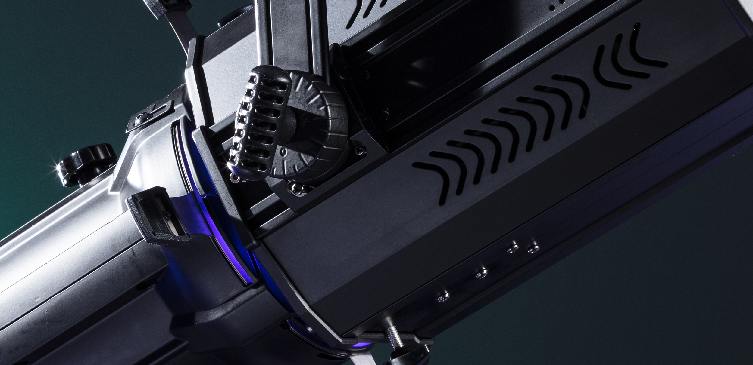 The cooling system uses high precision fans in order to keep noise within 25dB @ 1m. The 4 beam-shaping shutter system allows both radial and angled adjustment of the beam. The fixture is equipped with a compartment for gobos and manual iris (both optional), as well as the front color-frame holder (included).