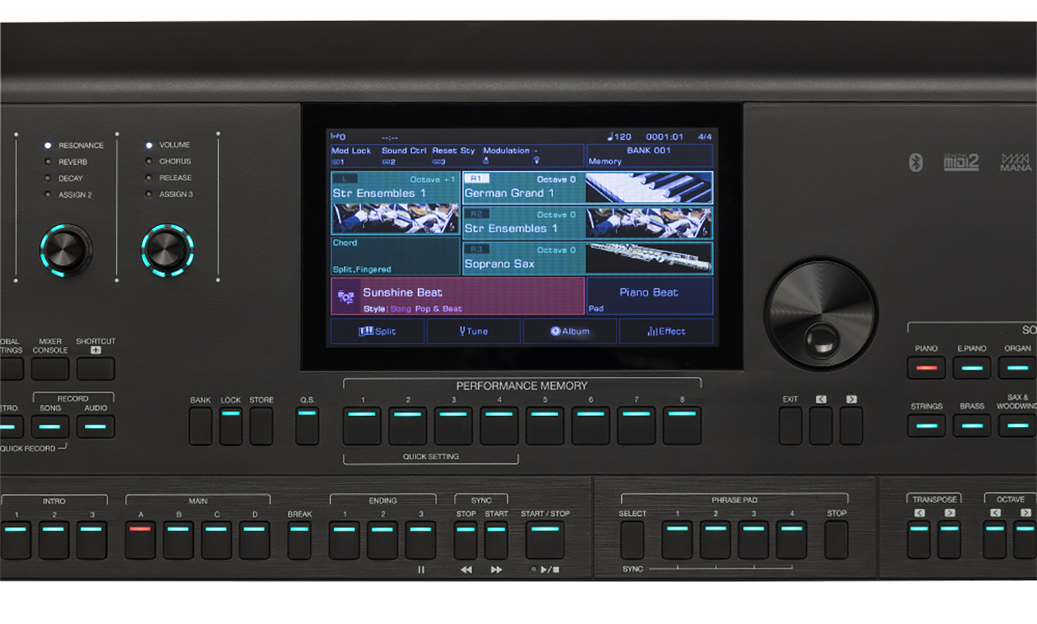The control panel of the AKX10 keyboard is equipped with illuminated buttons for easy and intuitive use during your performances by controlling the automatic accompaniments, the realtime parts, the Phrase Pad and much more.