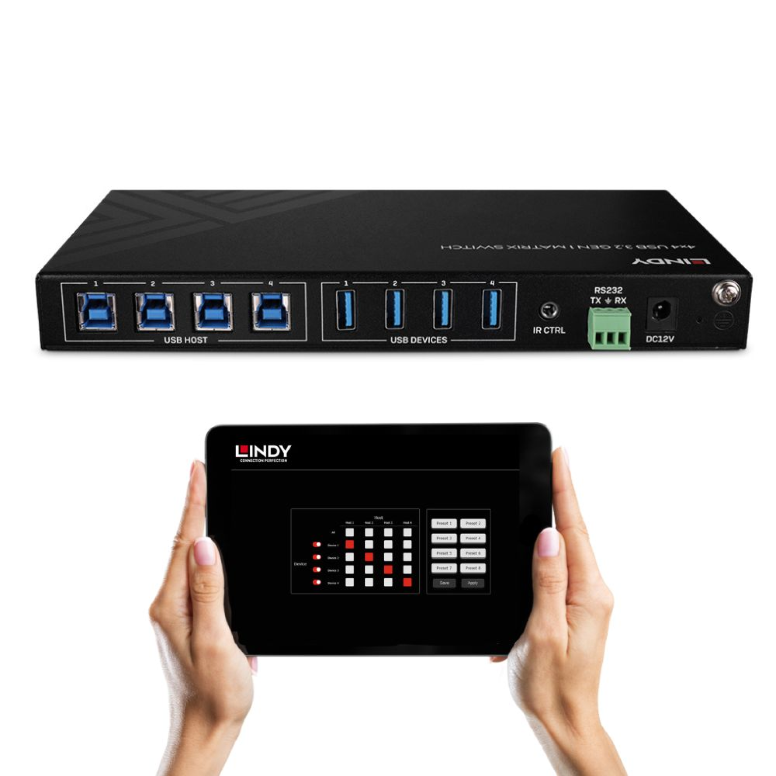 The Lindy USB 3.2 Gen 1 Matrix Switch allows the user to share up to 4 USB devices to up to 4 hosts in many different ways: by pushing the buttons on the front panel, via web GUI and using RS-232 commands.